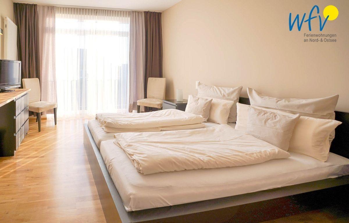 Das separate Schlafzimmer der Ferienwohnung verfügt über ein Doppelbett mit zwei hochwertigen Qualitätsmatratzen (mit Matratzenschoner und Lattenrost), zwei Nachttische mit Leselampe, zwei geräumige Kommoden, zwei Stühle und einen Schreibplatz. Dimmbare Deckenbeleuchtungen und raumhohe, nach Süden hin ausgerichtete Fenster (gut abzudunkeln durch Übervorhänge) sorgen für einen schönen Lichteinfall bzw. zusätzliche Gemütlichkeit. Die Schlafcouch im Wohnraum ist aufklappbar (auf 160 x 200 cm) und bietet Schlafmöglichkeiten für zwei weitere Personen.