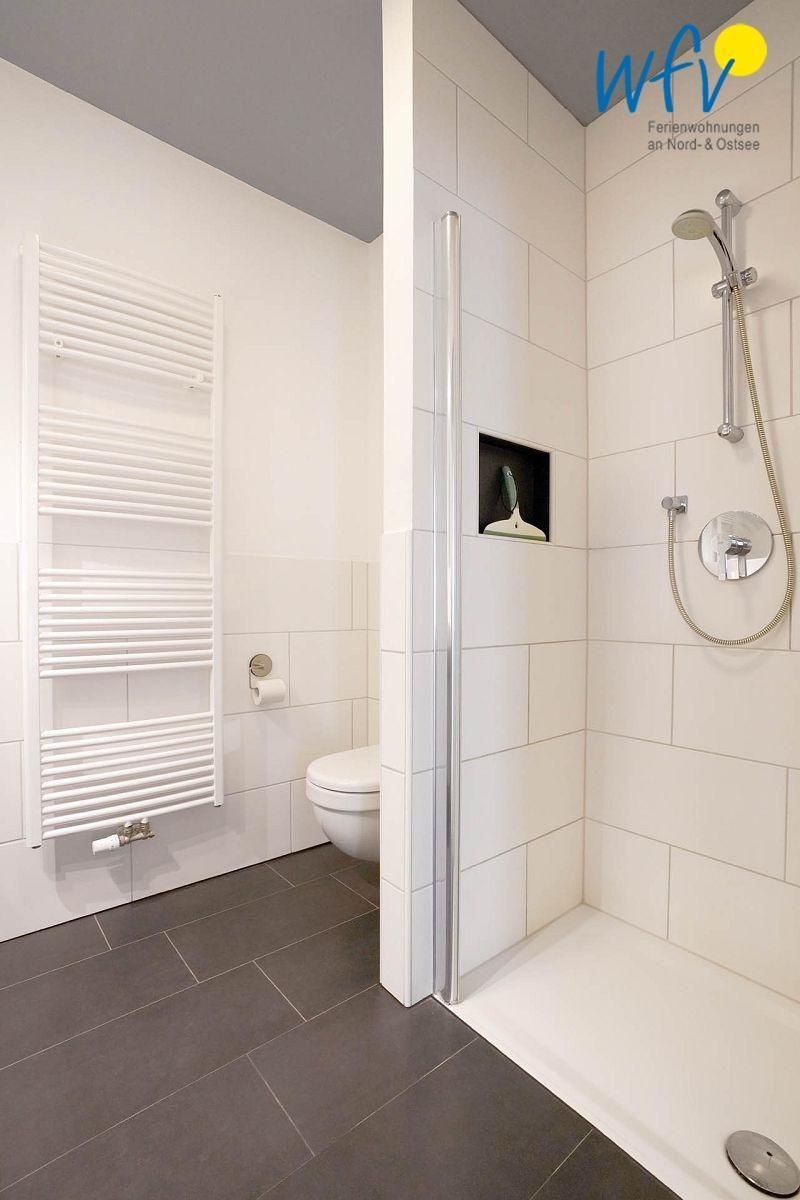 Wohnkomfort erwartet Sie auch im Badezimmer der Borkumer Ferienwohnung. Zur Ausstattung gehören eine bodengleiche Dusche, ein Designwaschtisch und ein Hänge-WC sowie ein raumbreiter Spiegel und ein Fön. Eine Fußbodenheizung sorgt für wohlige Wärme - besonders in der kalten Jahreszeit ein Genuss!
