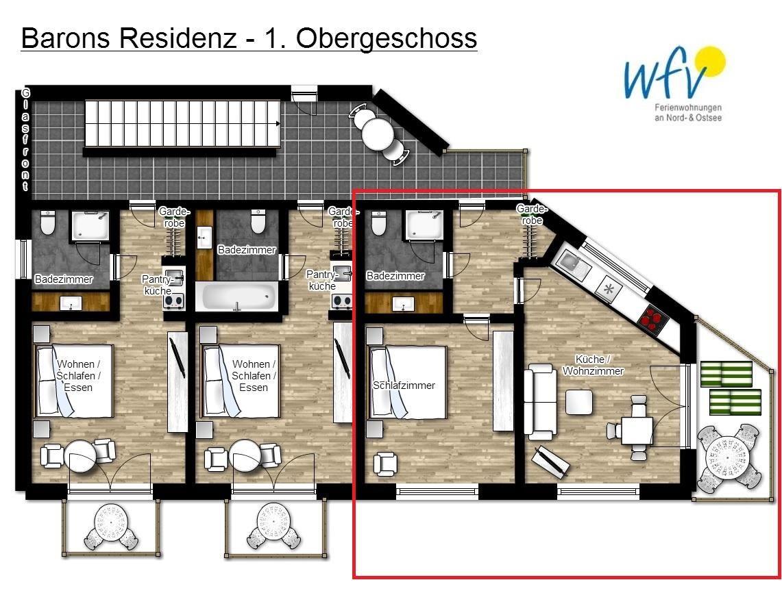 Helle Räume, modernes Mobiliar und eine sonnige Terrasse - lassen Sie es sich in unserer Ferienwohnung auf Borkum rundum gut gehen. Mit bis zu vier Personen werden Sie in der "Barons Residenz" herrliche Urlaubstage genießen!
