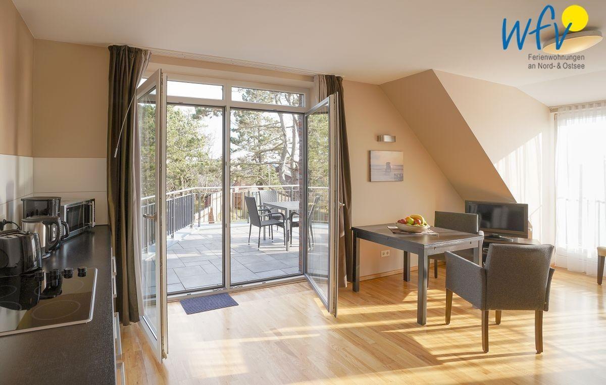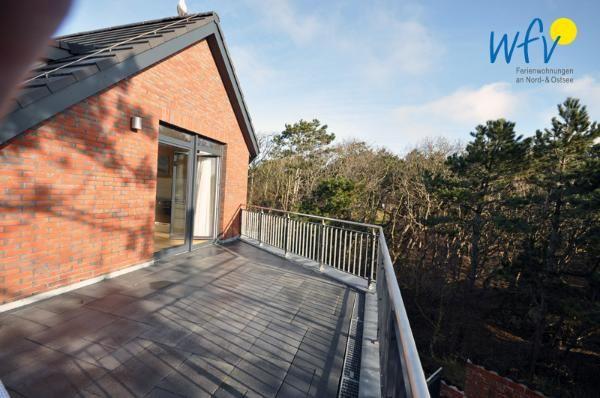 Raumhohe Fenster sorgen für einen hellen Lichteinfall und verleihen der Ferienwohnung eine freundliche Atmosphäre, in der Sie sich auf Anhieb wohlfühlen werden. Die Fenster zeigen nach Osten zur Dachterrasse sowie nach Süden und bieten Ihnen einen malerischen Blick auf die Nordsee und das Waldgebiet.