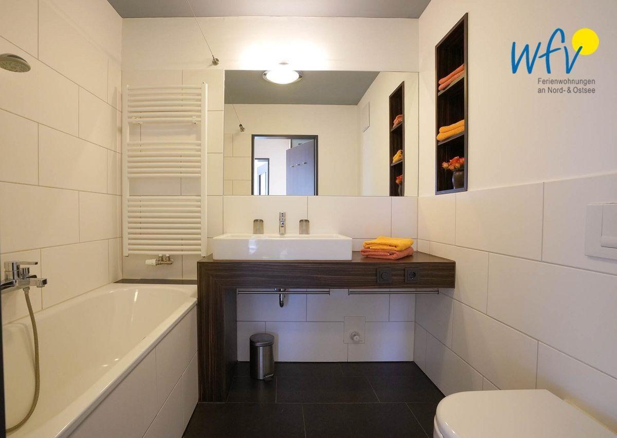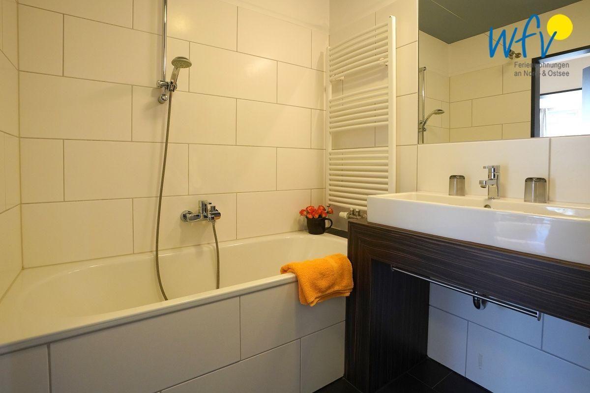 Genießen Sie angenehmen Wohnkomfort auch im Badezimmer - mit Badewanne, Designwaschtisch, Fußbodenheizung und einem breiten Spiegel! Ideal, um nach ausgiebigen Strandspaziergängen im heißen Schaumbad die Seele baumeln zu lassen! Ein Fön gehört zum festen Inventar.
