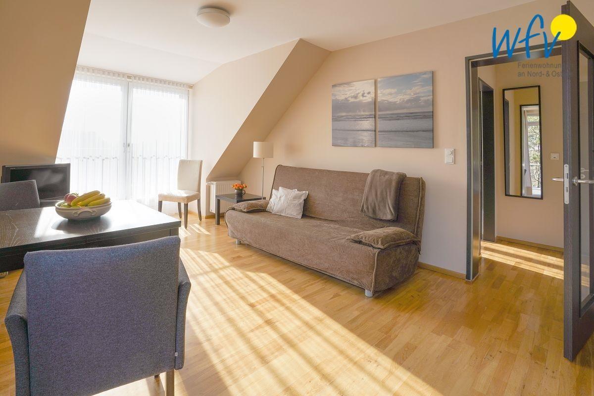 Urlaubszeit bedeutet Familienzeit! Freuen Sie sich auf gemeinsame Filmabende und ein gemütliches Beisammensein! Das Wohnzimmer der Ferienwohnung ist dazu mit einer großen Couch, einem modernen Flachbildfernseher, einem Radio mit CD+USB und freiem WLAN ausgestattet. Stilvolles Mobiliar - harmonierend mit dem hübschen Eichenparkett - und eine dimmbare Deckenbeleuchtung machen den Raum zu Ihrer persönlichen Erholungsinsel!
