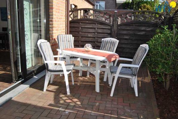 Auf der großzügigen möblierten Terrasse der Borkumer Ferienwohnung werden Sie sich wunderbar erholen! Sie ist mit einem Gartentisch und vier Gartenstühlen ausgestattet (Sitzauflagen im Abstellraum). Auch gemeinsame Grill-abende mit der gesamten Familie sind möglich: ein großer Grill steht schon für Sie bereit.