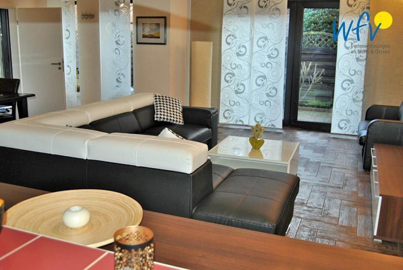 Im Erdgeschoss der Borkumer Ferienwohnung befindet sich der stilvoll eingerichtete Wohn-/ und Essbereich mit einem großen Esstisch und Lederstühlen für 4 Personen. Die TV-Ecke ist mit zwei bequemen und modernen Ledercouchen, zwei Sitz-/bzw. Fußhockern und zwei Couchtischen ausgestattet. Mit Flachbildschirm und Stereoanlage können Sie es sich hier herrlich gemütlich machen!