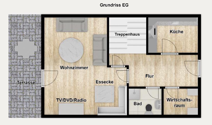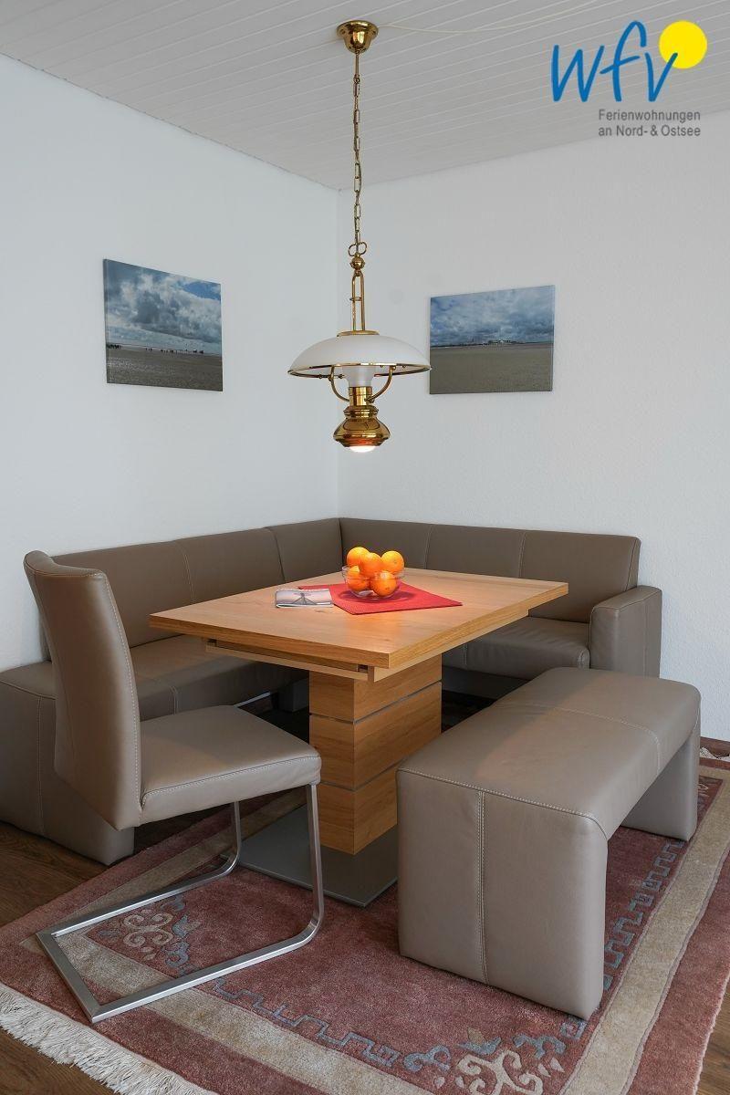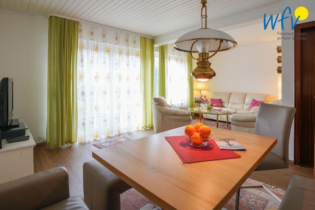 Der Wohnraum im Erdgeschoss wurde u.a. mit einer einladenden Essecke und einer bequemen Sitzgarnitur eingerichtet - jeweils mit pflegeleichten Dicklederbezügen - sowie mit einer guten technischen Ausstattung mit 55" Smart-TV, HiFi-Anlage inkl. Receiver, Video/DVD- und separatem CD-Player. Ein sehr gemütlicher Ort für gemeinsame Stunden!