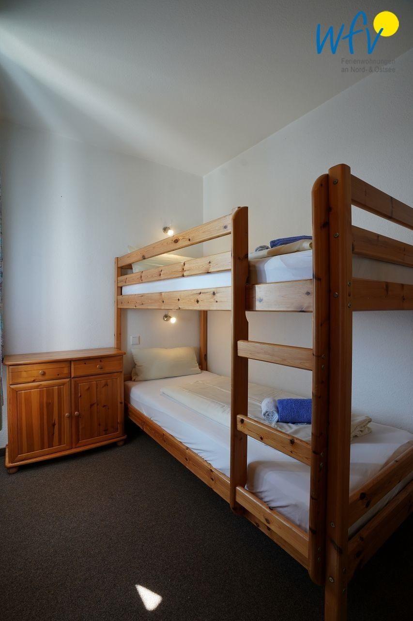Das separate Schlafzimmer der Borkumer Ferienwohnung ist mit einem Etagenbett und einem geräumigen Kleiderschrank ausgestattet und wird gerne als Kinderschlafzimmer genutzt. Schlafmöglichkeiten für zwei weitere Personen bestehen durch die Schlafecke im Wohnraum. Hier befindet sich ein bequemes Doppelbett, das durch einen Vorhang vom Wohnraum abgetrennt werden kann.