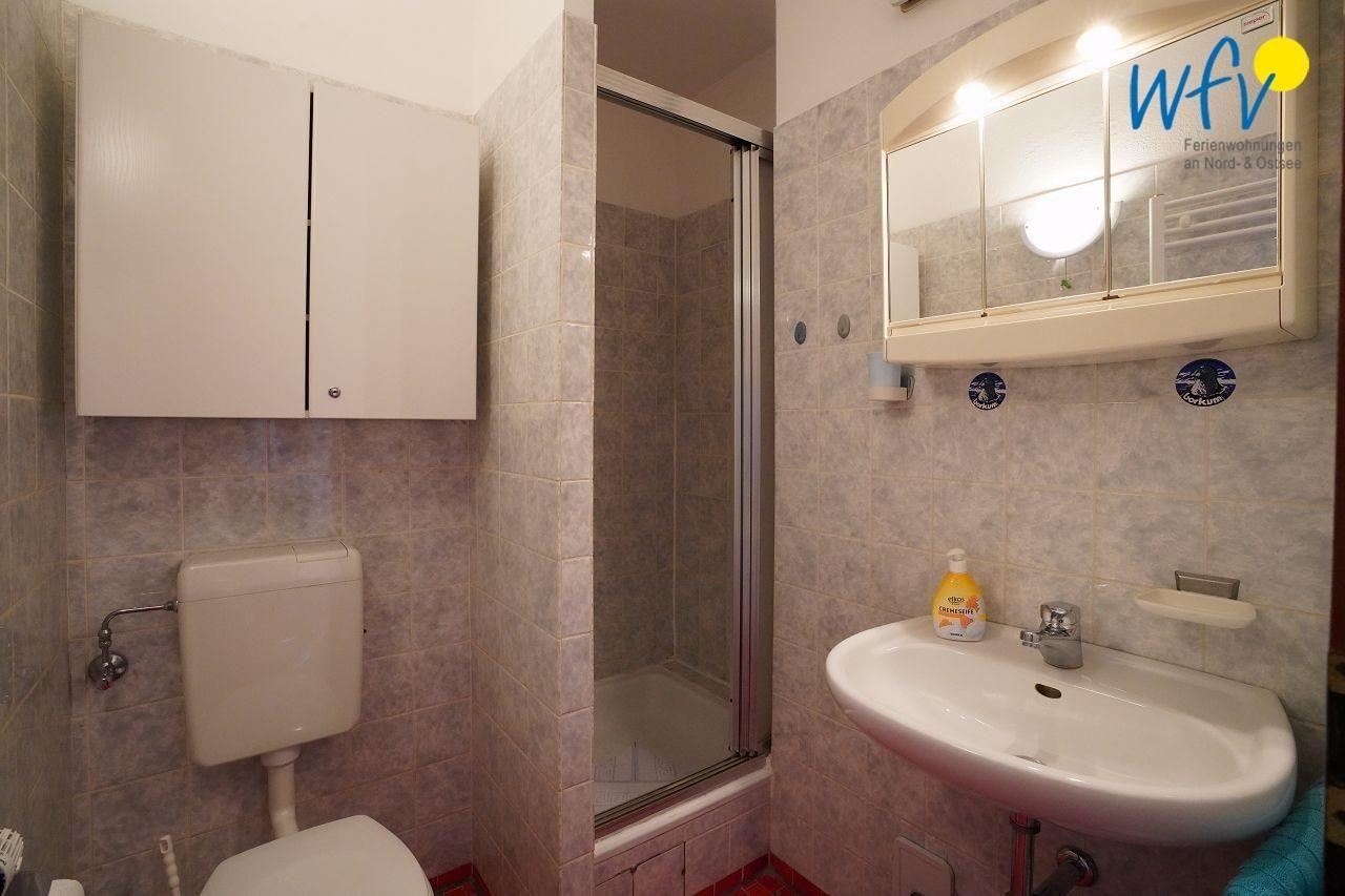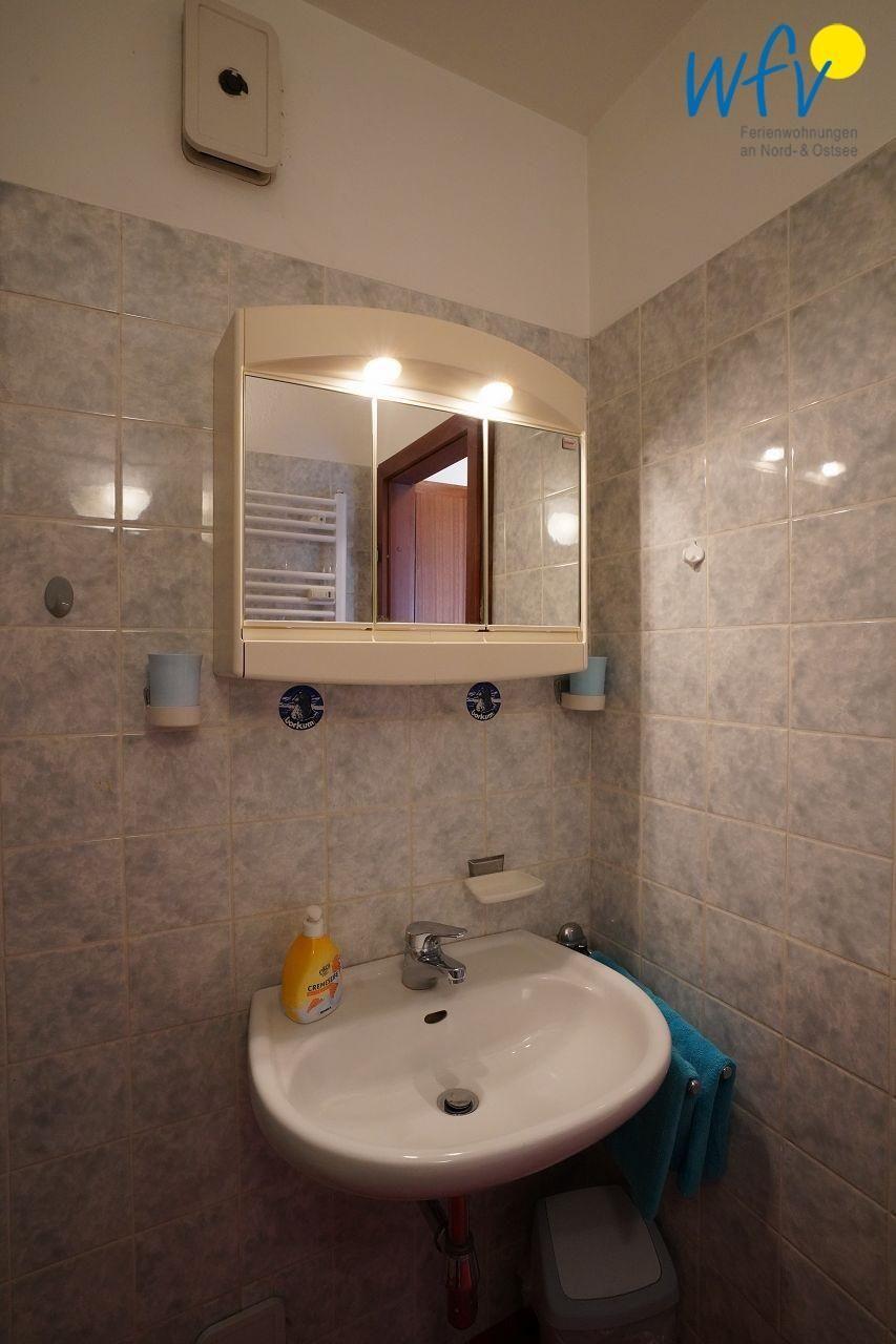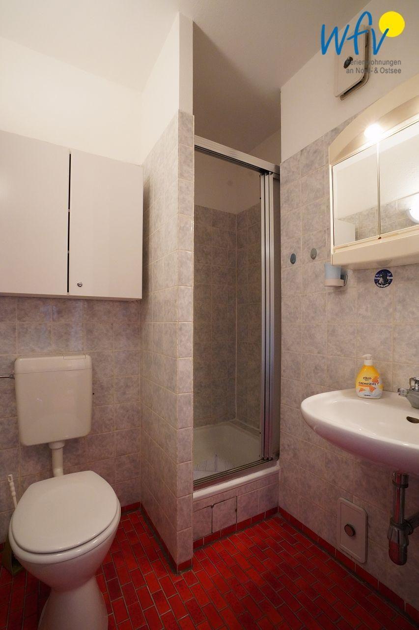 Das Badezimmer der Ferienwohnung verfügt über ein Waschbecken, ein WC und eine Dusche. Zur Einrichtung gehören außerdem ein Spiegelschrank und ein Handtuchheizkörper. Ein Fön befindet sich im Wandschrank und kann gerne von Ihnen genutzt werden.