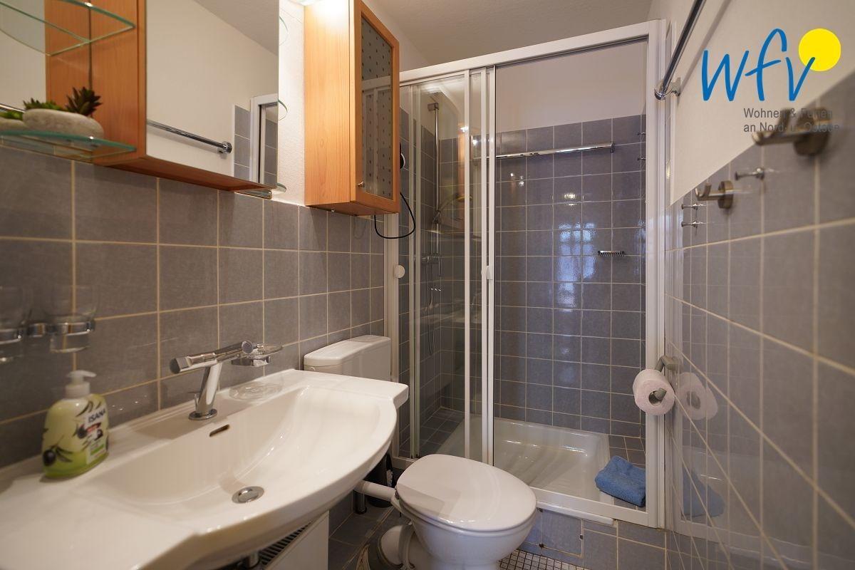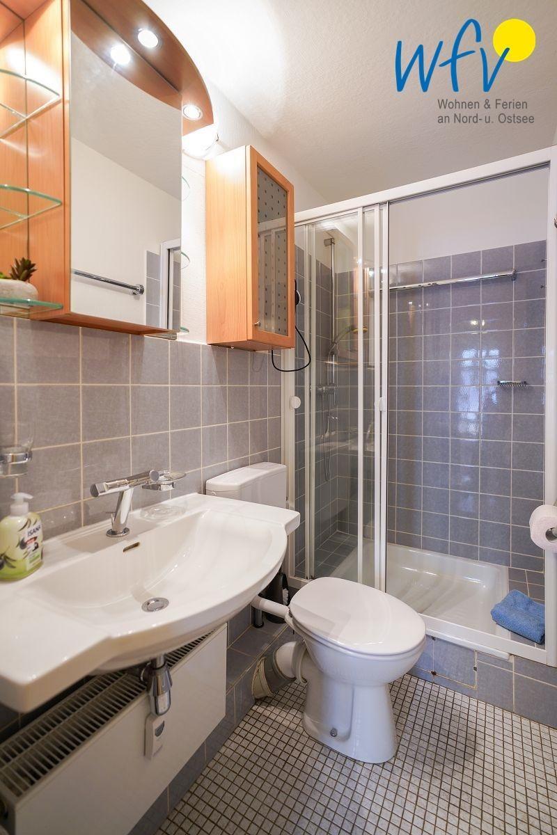 Das gepflegte Badezimmer wurde mit einer Dusche, einem Waschbecken und einem WC ausgestattet. Ein Föhn gehört zum festen Inventar.