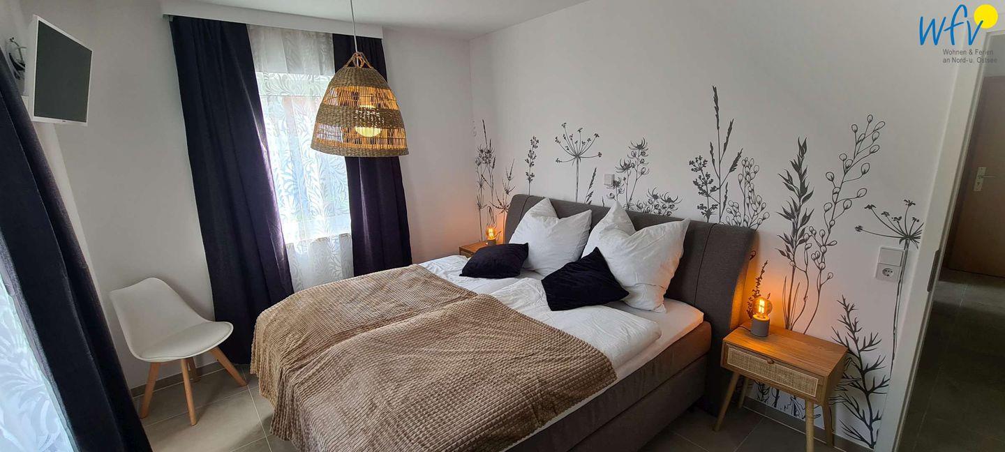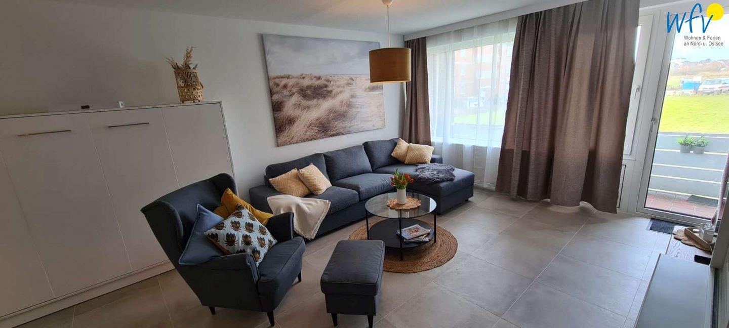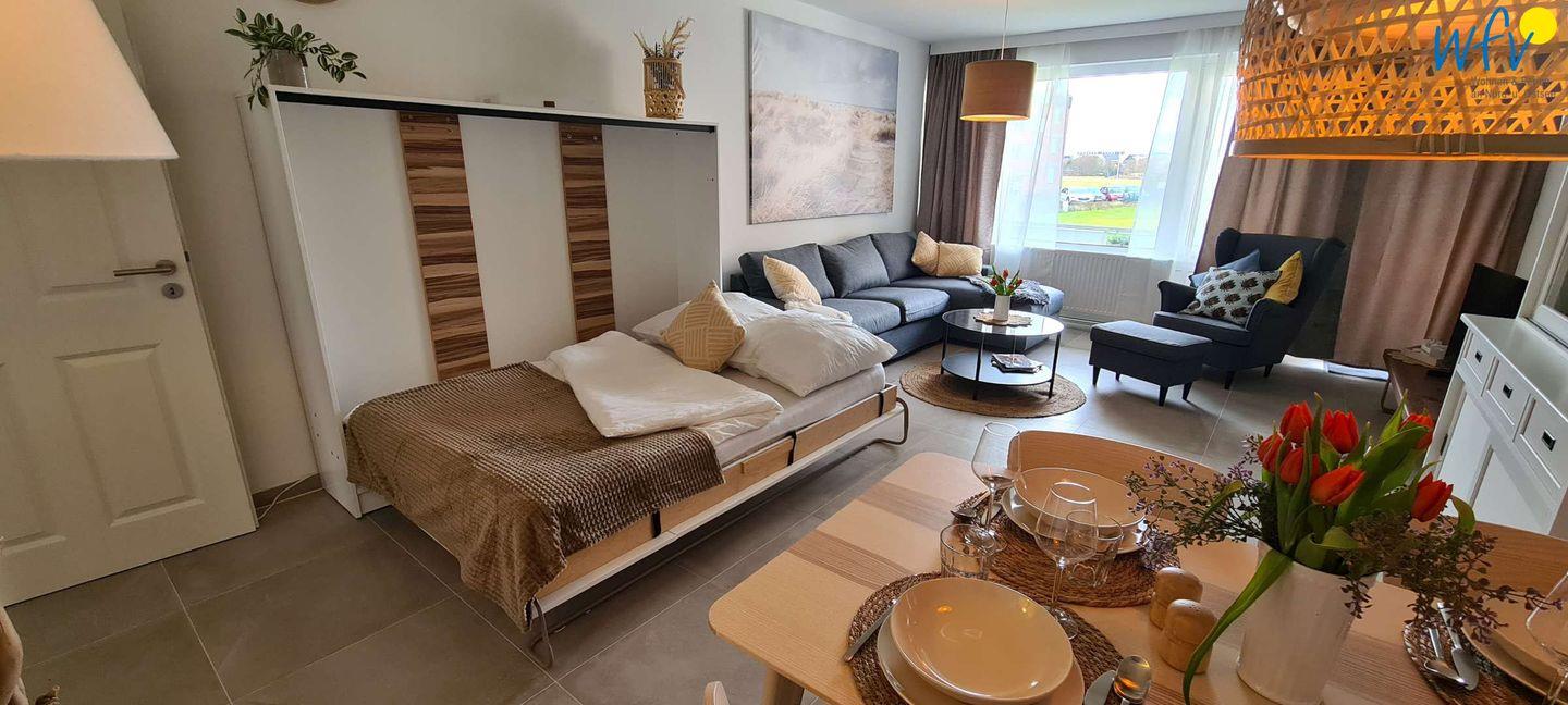 Wenn die Sonne auf Borkum untergeht, warten sehr bequeme Betten auf Sie! In dem separaten Schlafzimmer befindet sich ein Doppel-Boxspringbett (1,80 m x 2 m). Für weitere Schlafmöglichkeiten können Sie im Wohnraum ein Schrankbett und die ausziehbare Eckcouch nutzen (jeweils 1,40 m x 2 m).