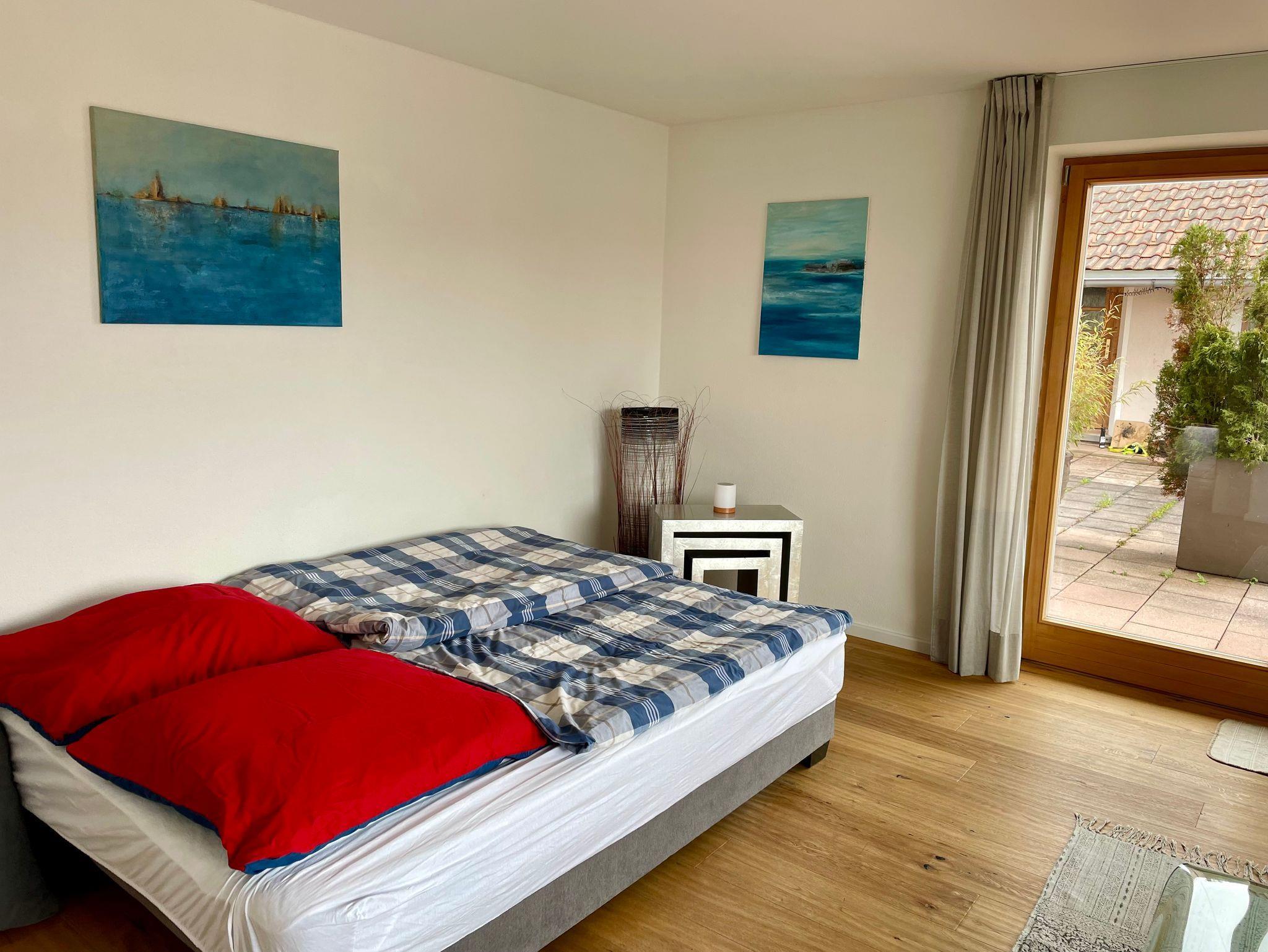 Die etwas größere Ferienwohnung hat zwei Schlafzimmern (neues Boxspringbett, zwei Einzelbetten) plus Schlaf-Wohnzimmer mit neuer komfortabler Boxspring-Schlafcouch (2 Personen), eine große Küche mit luxuriöser Ausstattung und wohnlichem Essbereich. Die sonnige Terrasse (30qm) lädt mit gemütlichen Terrassenmöbeln zum Lesen, Entspannen und draußen Essen ein. Das Bad ist mit Badewanne, Dusche und WC ausgestattet. Ein separates WC ist zusätzlich vorhanden.
