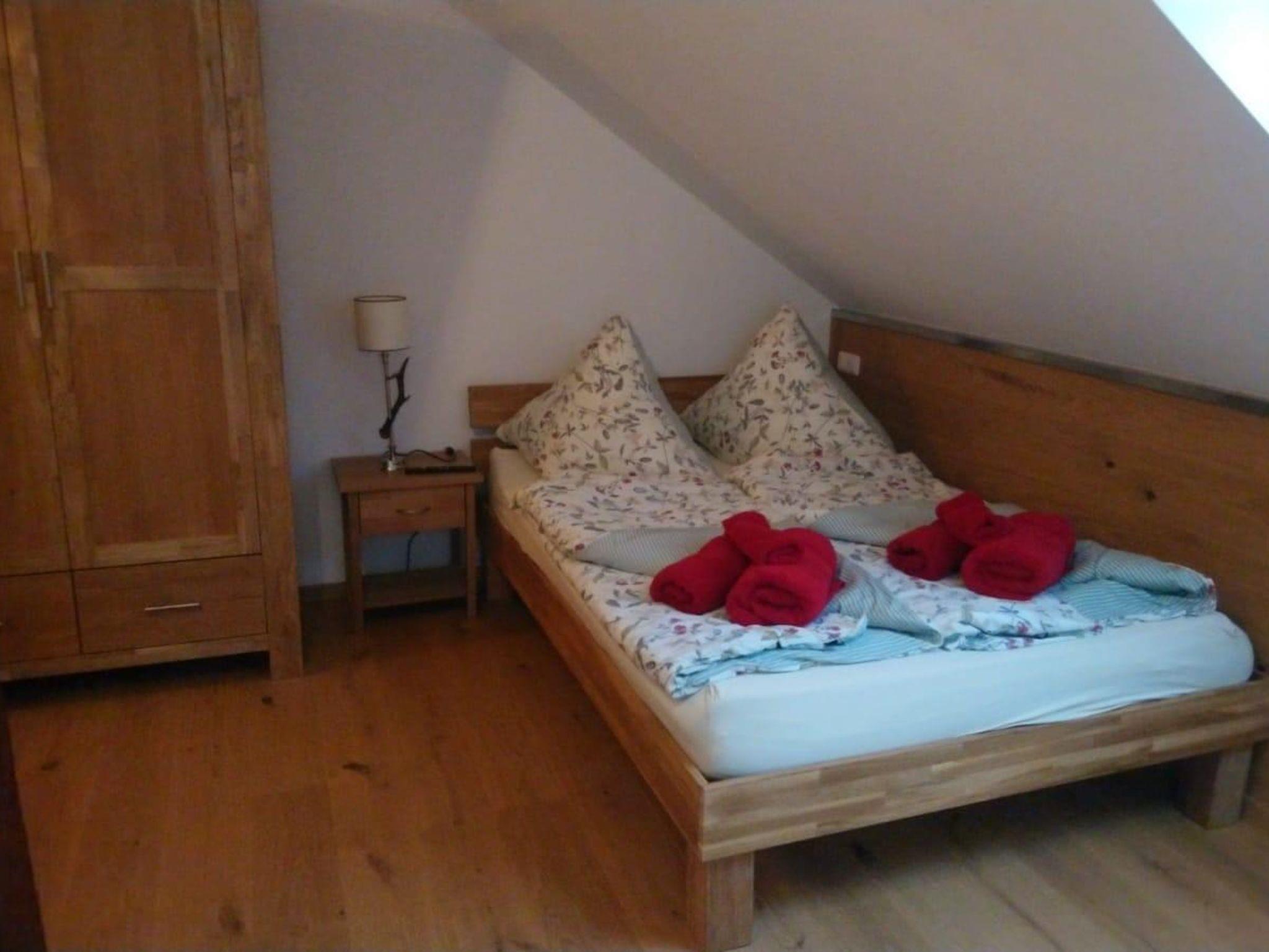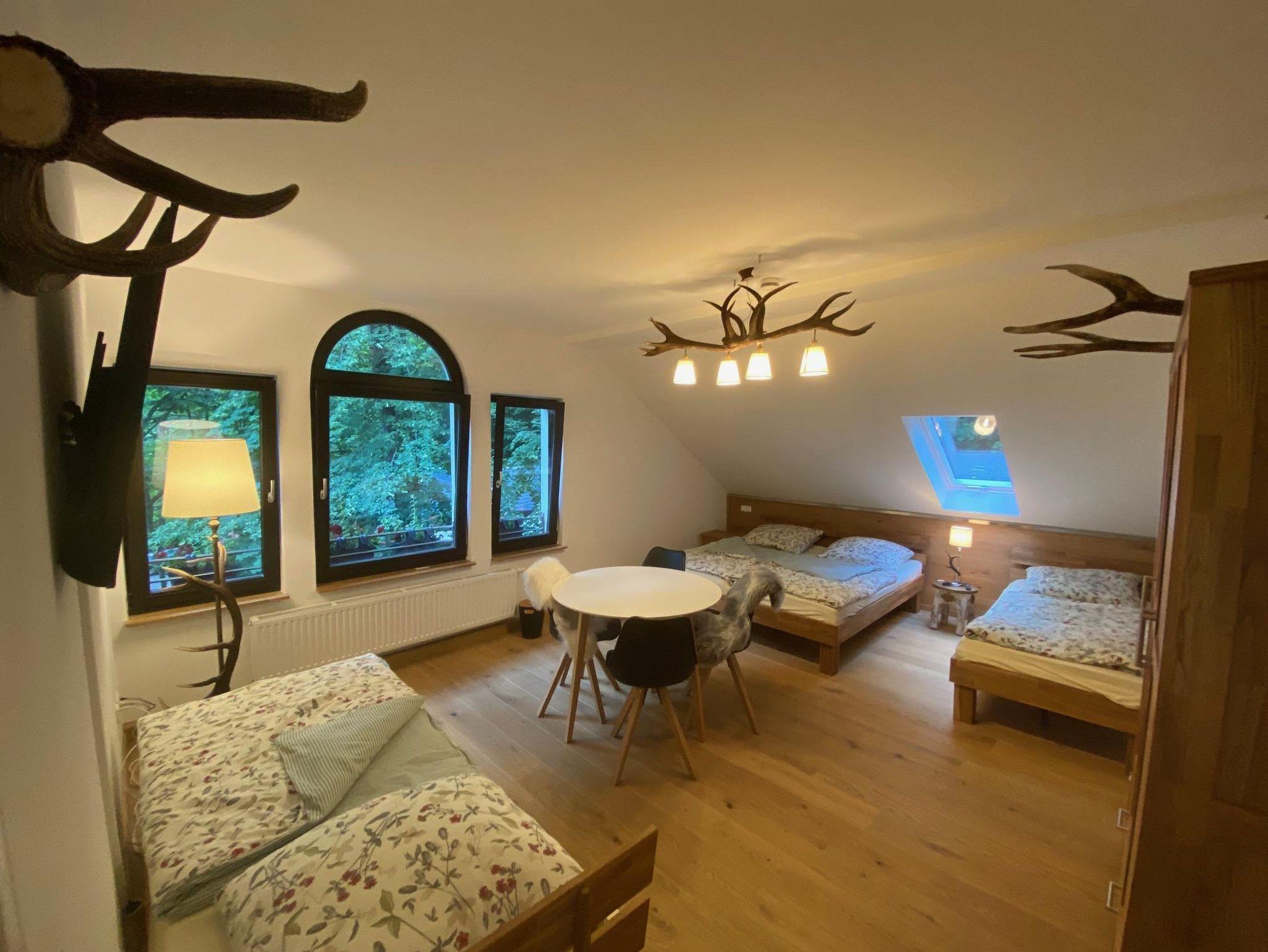 Im Dachgeschoss auf der rechten Seite erwartet Sie Ihr gemütliches Reich. Sie schlafen in 2 getrennten Räumen mit zwei 90x200cm Betten und einem Ehebett 180x200cm in einem Zimmer und im zweiten Zimmer bieten wir Ihnen ein 140x200cm Doppelbett, eine eine gut ausgestattete Küchenzeile, sowie eine gemütliche Sitzecke und einen TV dort integriert. Ein Glas Wein am Abend, ein Kaffee vor dem Start in den Tag ist jederzeit für Sie möglich. Sollten Sie ein Frühstück dazu buchen, können Sie dies hier in Ihrem eigenen Reich gerne in aller Ruhe genießen. Im Tageslicht-Bad mit Dusche können Sie mit Blick in den Himmel und die Baumkronen entspannen.