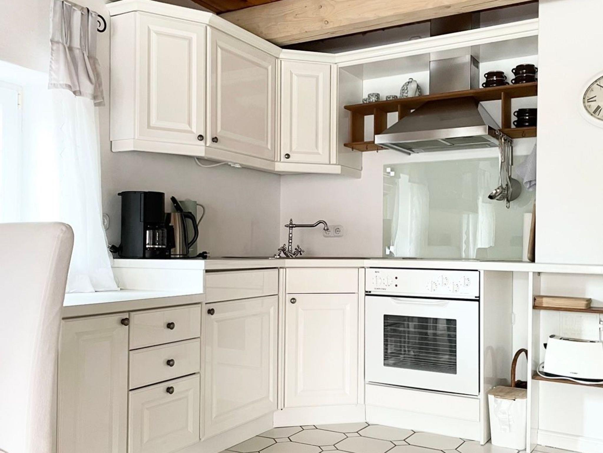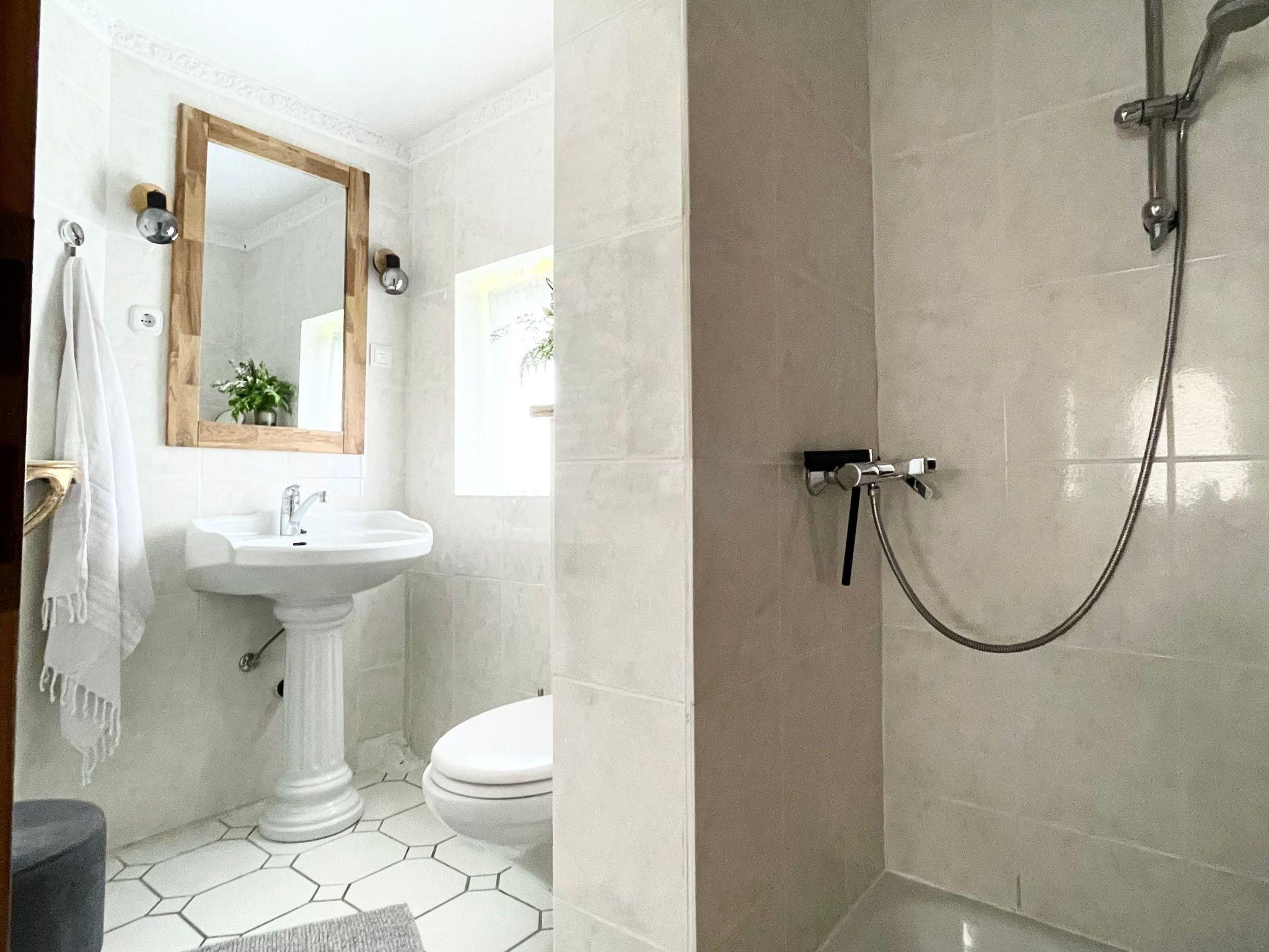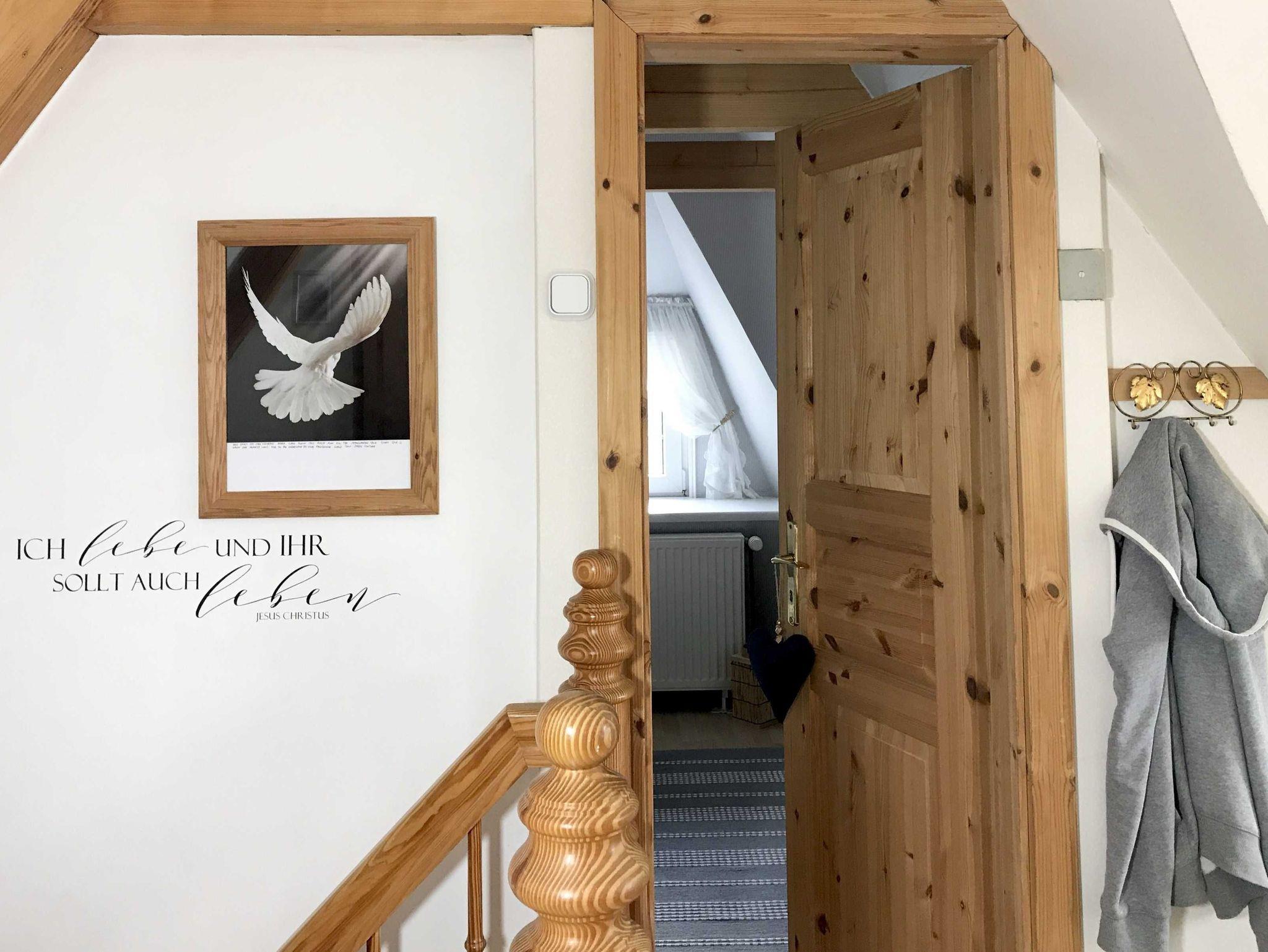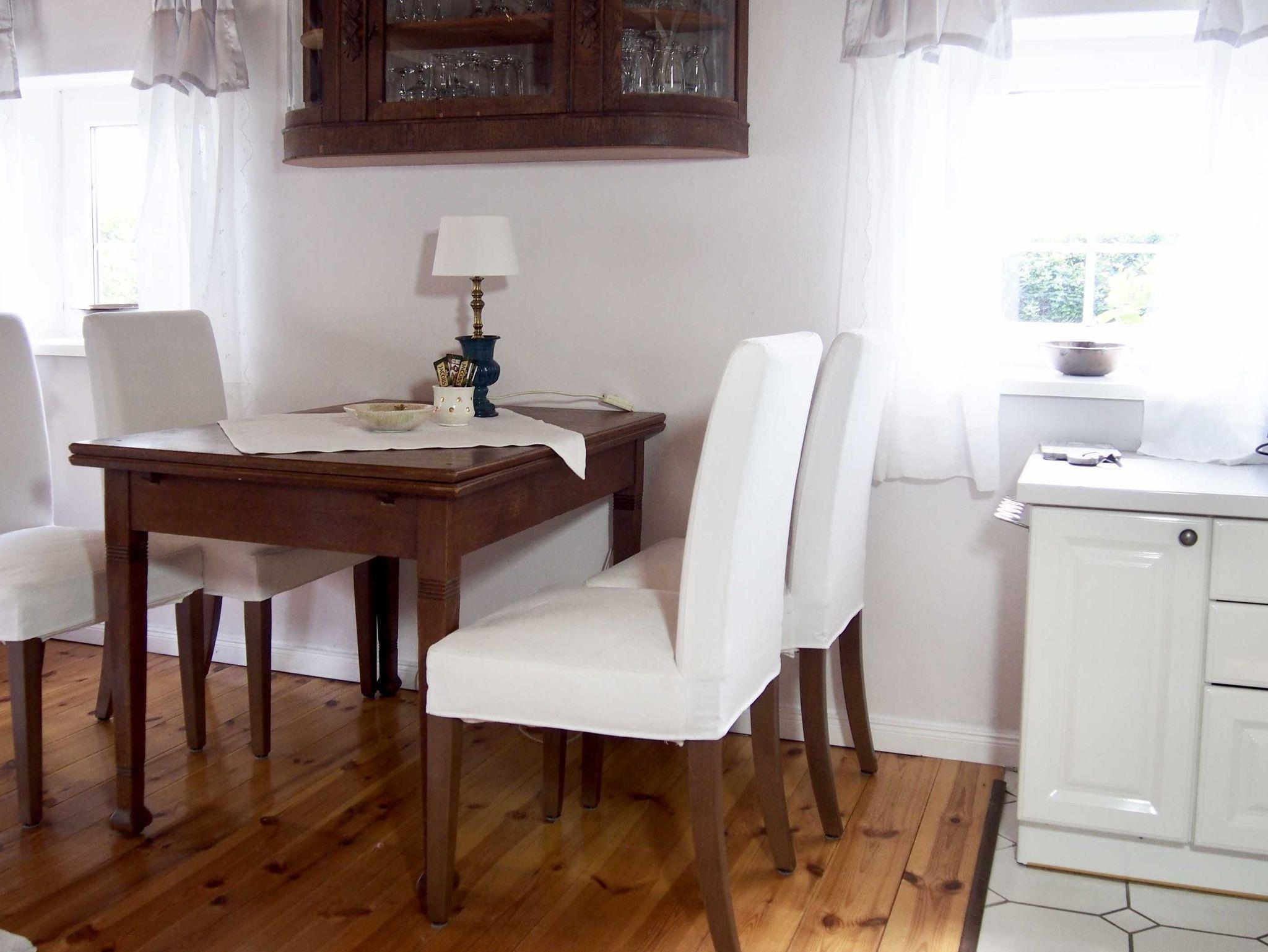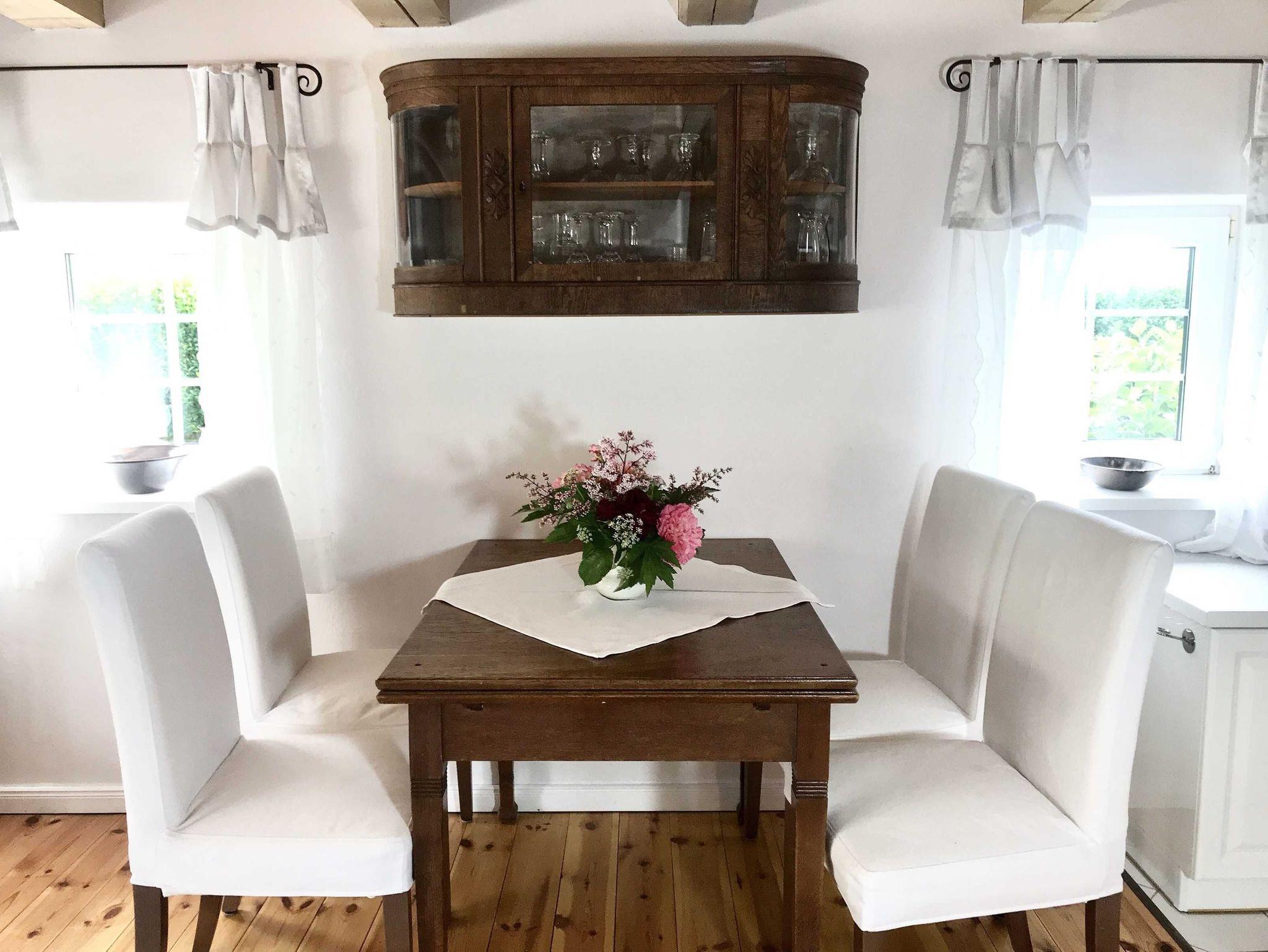 Die ersten Versicherungsunterlagen stammen aus dem Jahr 1820, das größere Haus ist also mindestens 200 Jahre alt. Immer wieder umgebaut und angebaut, blieben unverändert niedrige Deckenhöhe, schiefe Türzargen und lehmverputzte Wände in der 70 m2 Wohnung als stille Zeitzeugen…