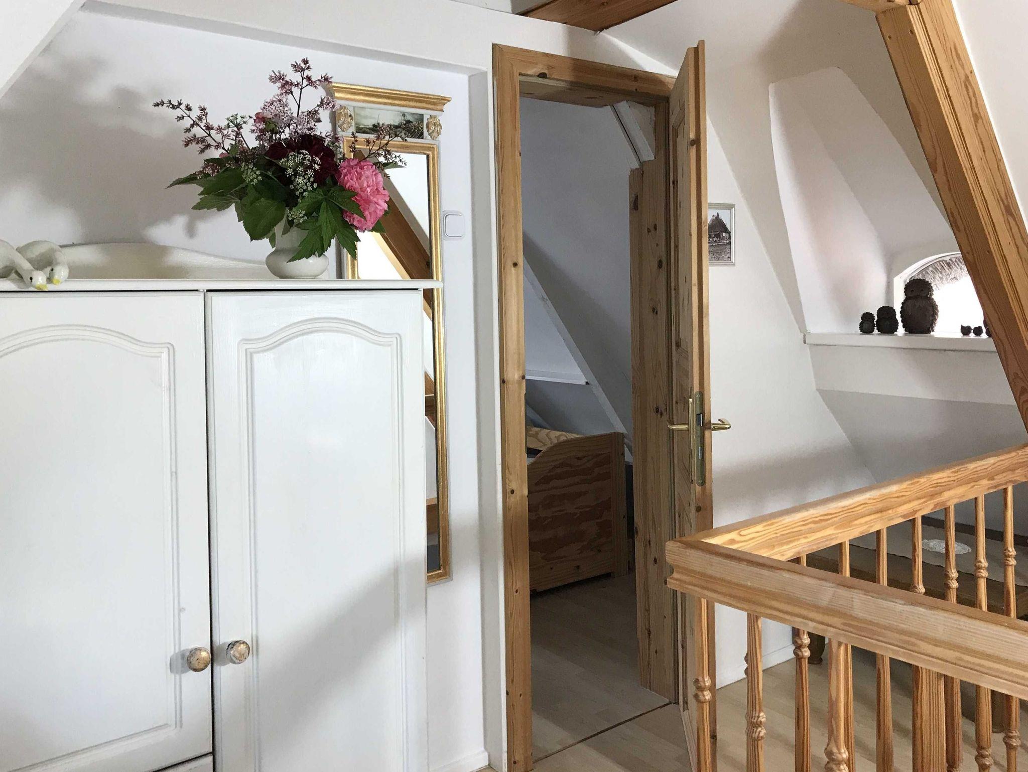 Die 2 Schlafzimmer sind über eine Treppe erreichbar. Ein Zimmer mit Doppelbett, ein Zimmer mit 2 einzelnd stehenden Betten.