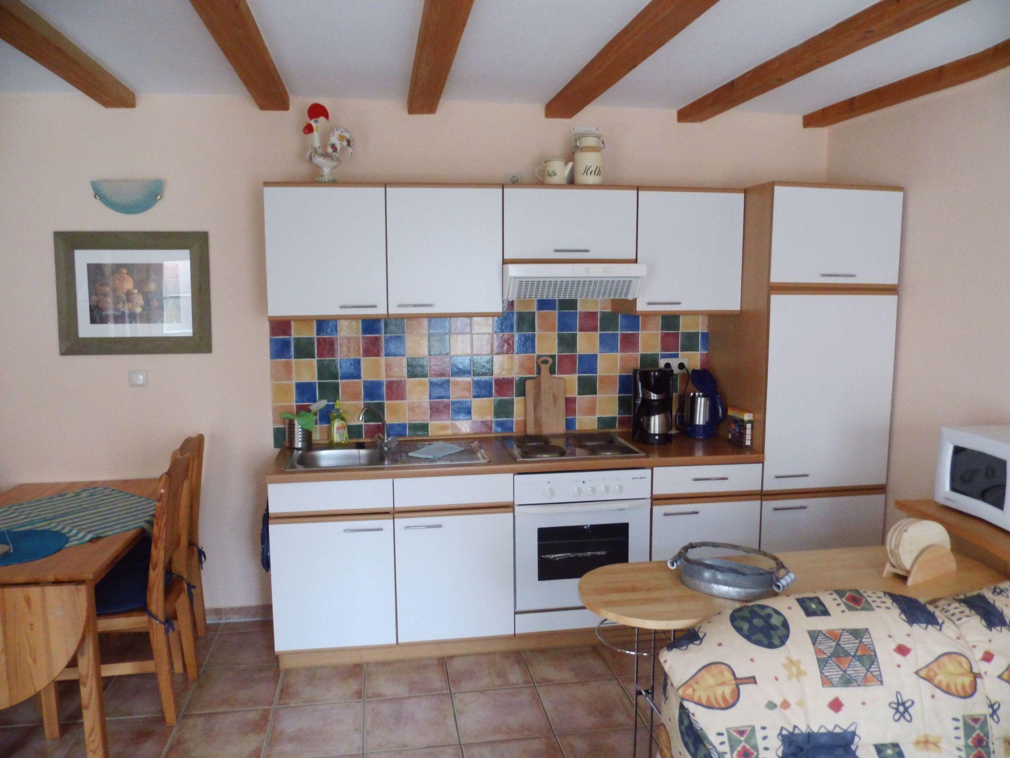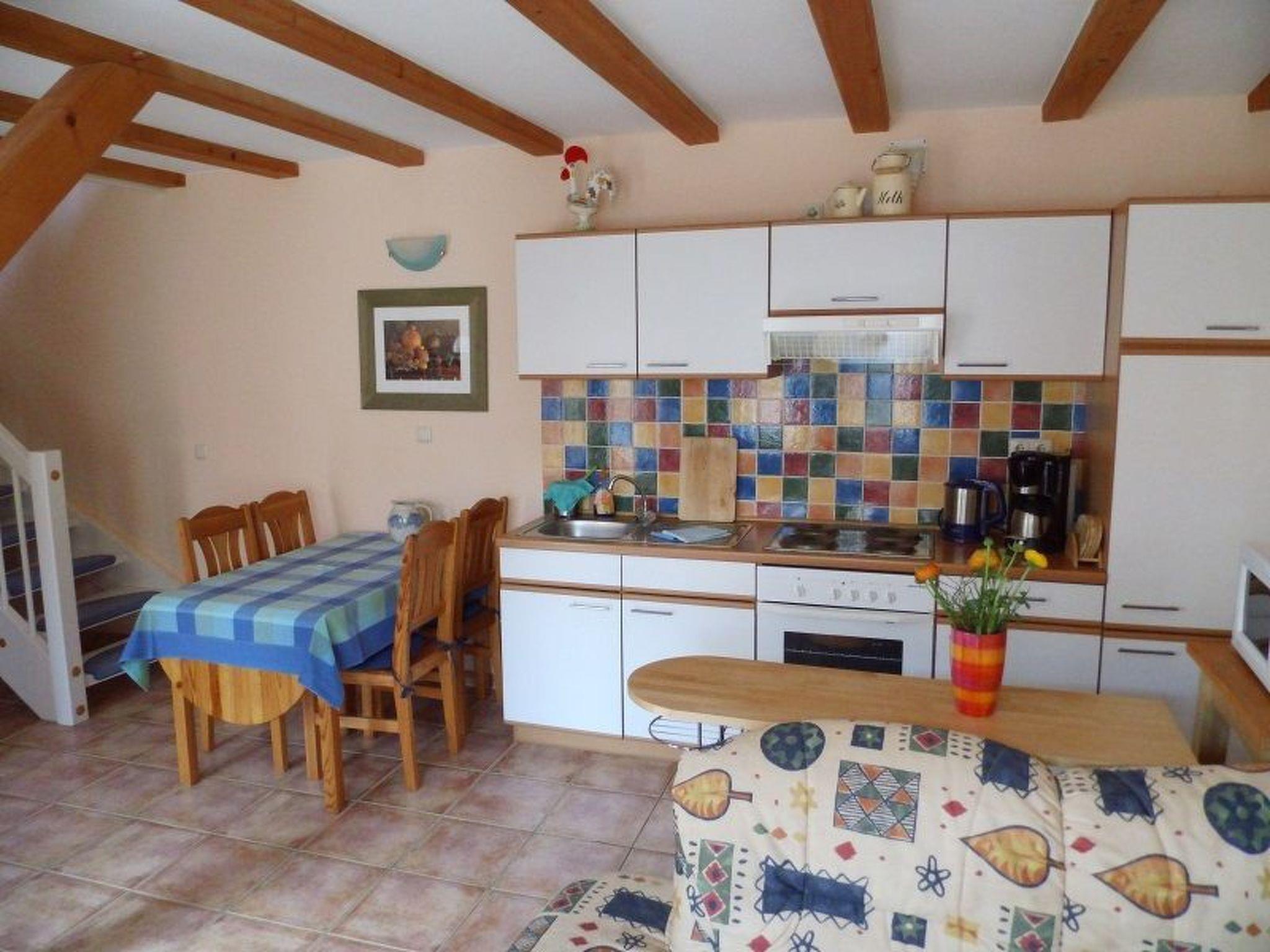 In der ca. 30m² großen Ferienwohnung erwartet Sie im Erdgeschoss ein gemütlicher Wohnraum mit einer Sitzgruppe und SAT-TV. Die Couch kann auch als Schlafgelegenheit genutzt werden. Weiterhin finden Sie hier die kleine komplett eingerichtete Küche vor. Neben allen wichtigen Küchenutensilien stehen weiterhin eine Mikrowelle, ein Toaster, ein zwei-Platten-Herd und ein Kühlschrank mit Gefrierfach für Sie bereit. Der Esstisch für vier Personen lädt nicht nur zum gemeinsamen Speisen sondern auch zum geselligen Beisammensein ein. Über eine offene Treppe gelangen Sie in den Schlafbereich mit einem Doppelbett und einem Kleiderschrank zum Verstauen Ihrer Garderobe. Ebenfalls befindet sich hier das Duschbad mit WC.