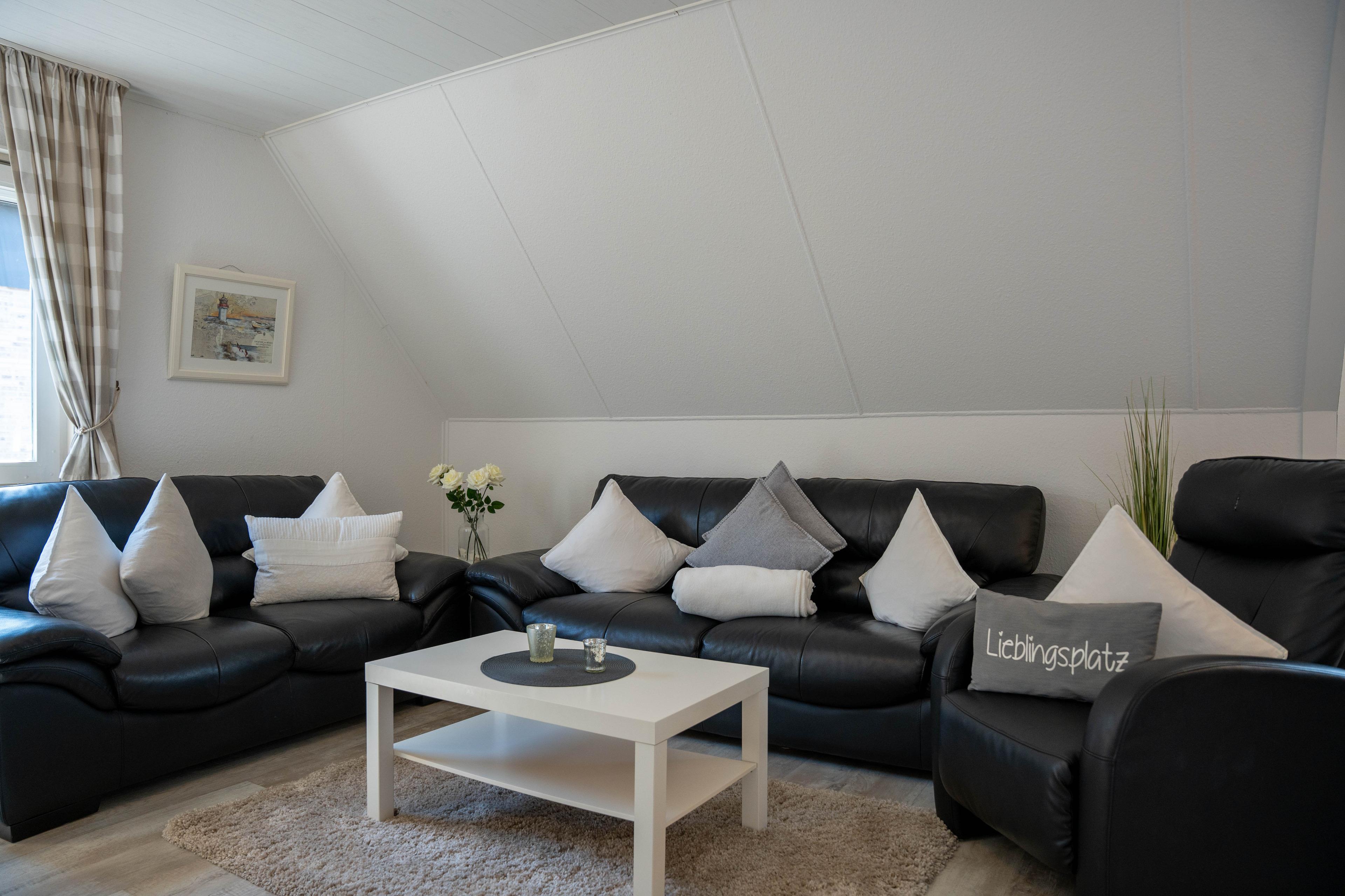 Die ca. 100 qm große Ferienwohnung befindet sich im 1. OG und Dachgeschoss des Hauses. Es stehen Ihnen 2 Elternschlafzimmer im OG und ein komplett neu gestaltetes Schlafzimmer mit gemütlicher Matratzen Schlafcouch (150x200 cm) und Kleiderschrank im Dachgeschoss sowie Meerblick zur Verfügung. Das neu und freundlich gestaltete Wohnzimmer mit 2er und 3er Couch, sowie Sessel und Esstisch wird Sie begeistern. Von hier aus, führt eine Treppe nach oben in das 3. Schlafzimmer mit Meerblick. Die separate Küche ist gut ausgestattet und verfügt über einen kleinen Esstisch mit Bestuhlung. Das Badezimmer ist mit einer Dusche und WC ausgestattet. Auf der zur Seeseite gelegenen 5x2 Meter großen, blickgeschützten Loggia lässt es sich in der Morgensonne gemütlich frühstücken und teilweise den Blick auf die Ostsee genießen. Die Ferienwohnung verfügt über Außenrollläden.