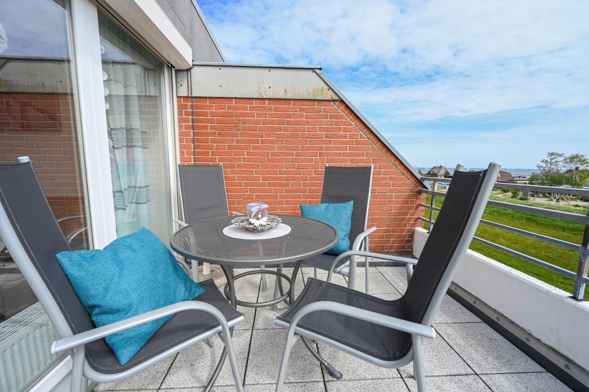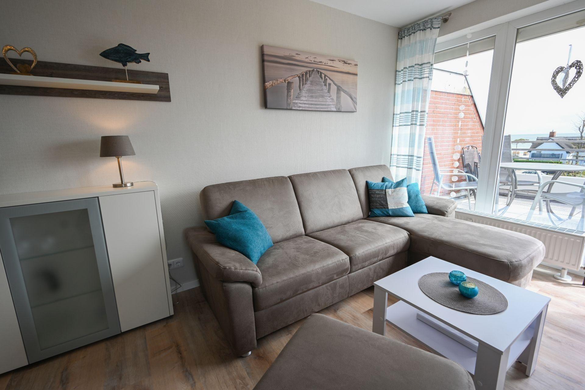 Ferienwohnung im 3. OG mit Meerblick vom Balkon! Ein Schlafzimmer, Wohnzimmer mit Schlafcouch helles Tageslichtduschbad und Küchenzeile. Waschmaschine und Trockner im Haus gegen Gebühr. Garagenstellplatz vorhanden. Ohne Fahrstuhl.