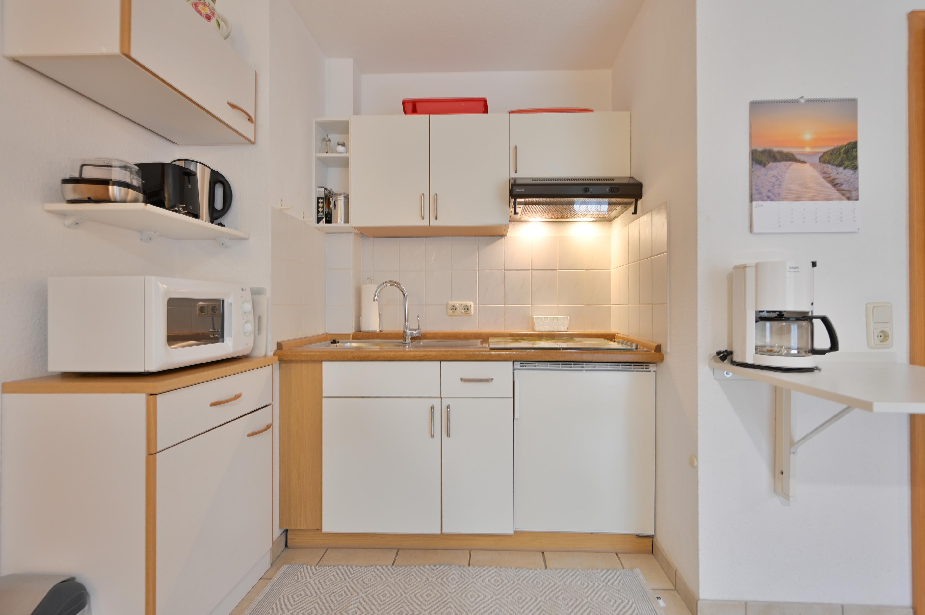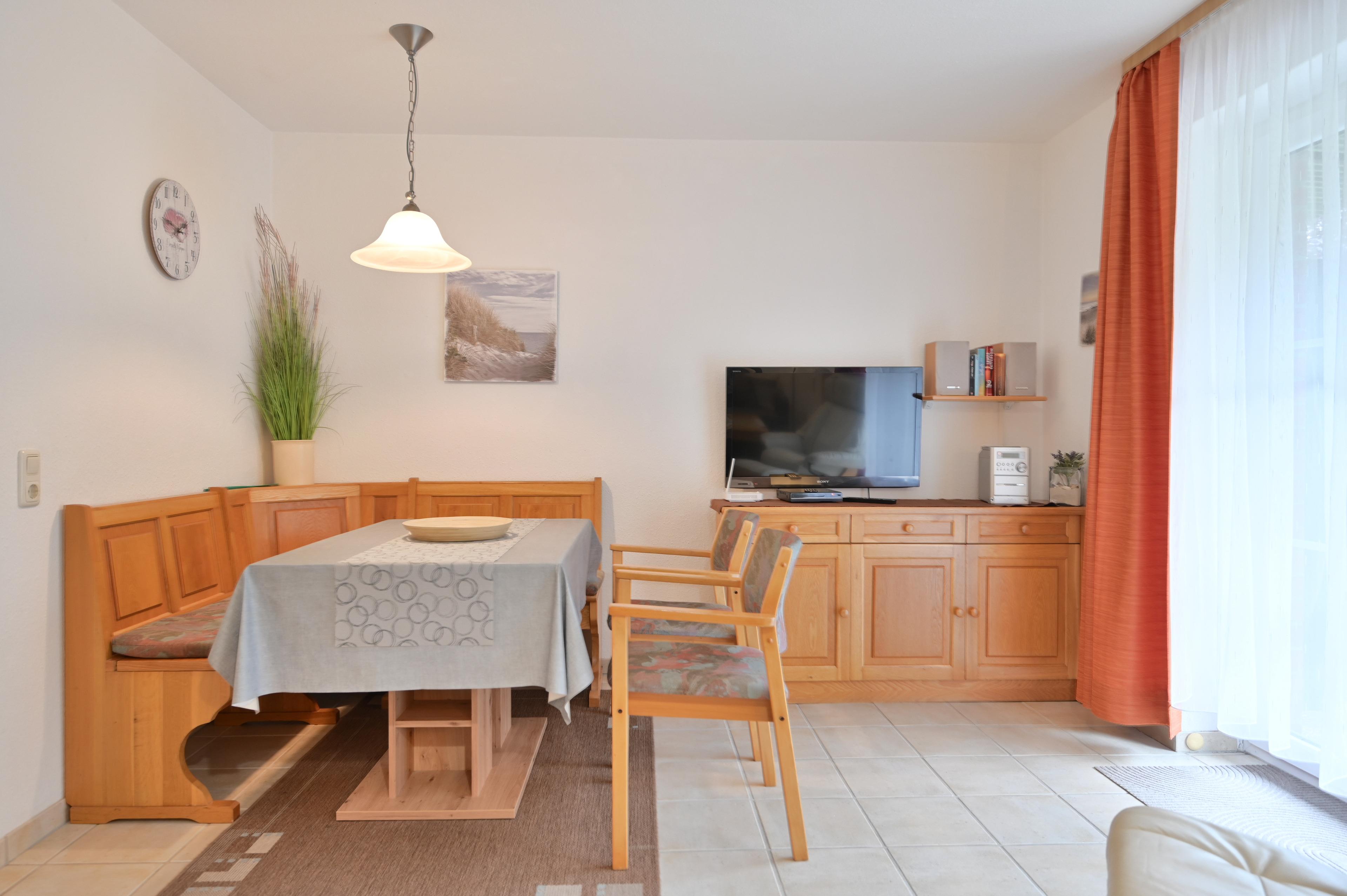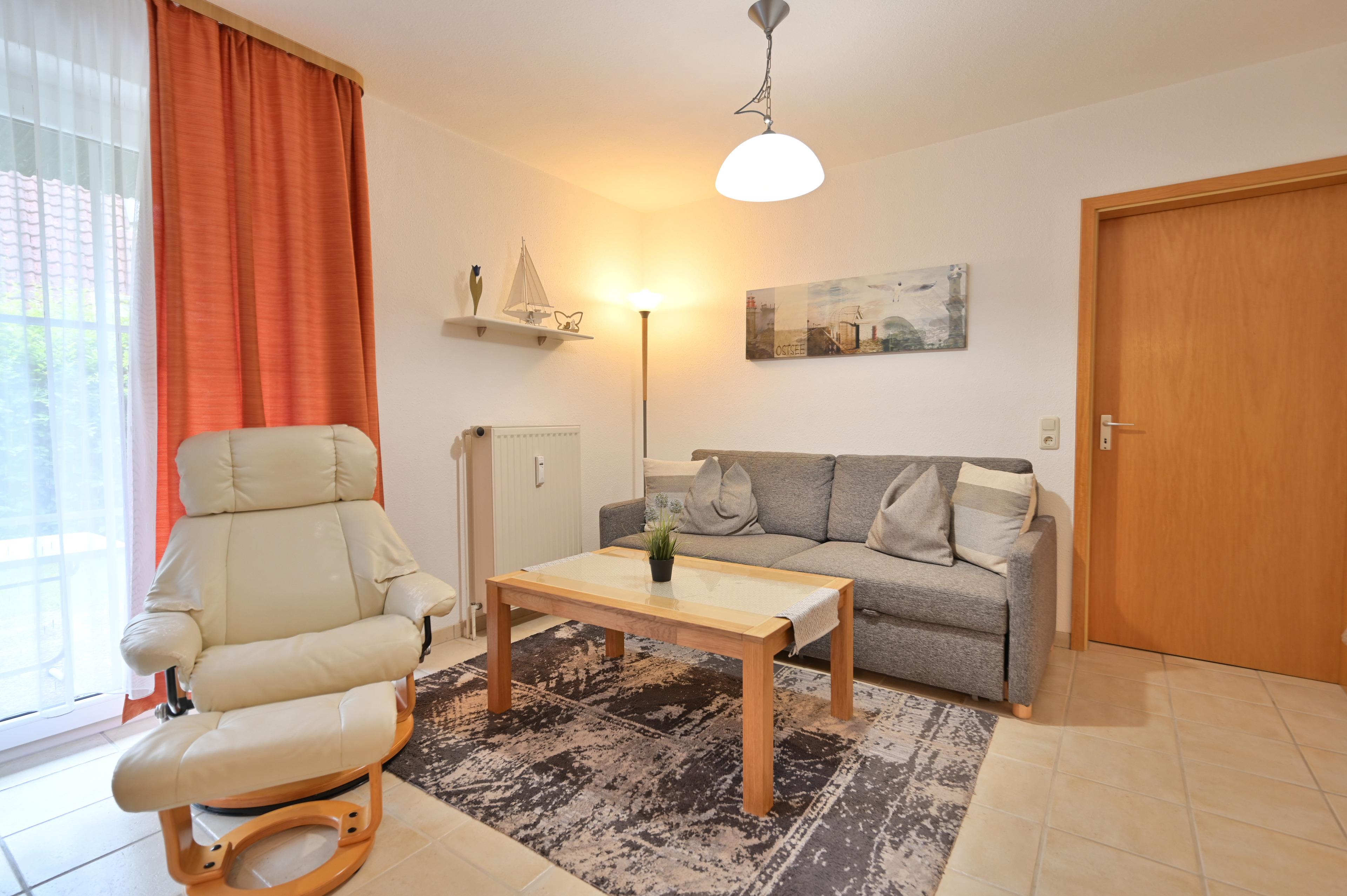 Die schöne Fewo von Familie Schnabel im Ostseebad Dahme liegt im Erdgeschoss und verfügt über einen Wohnschlafraum mit Schlafcouch (2 Personen) und integrierter Küchenzeile mit gemütlicher Essecke.