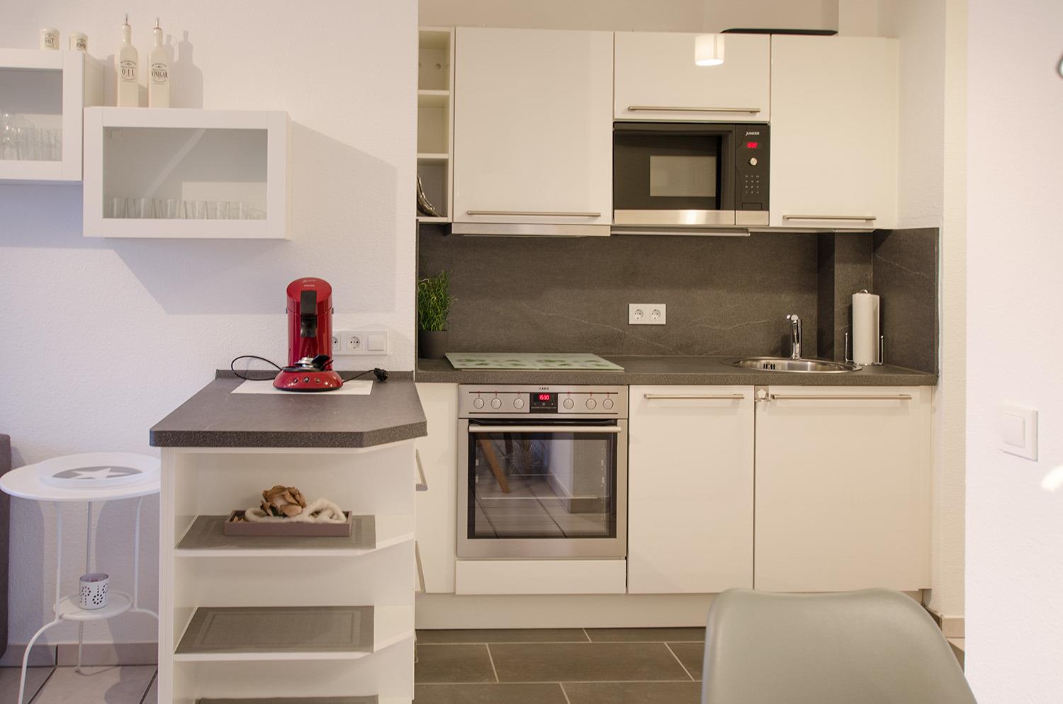 Direkt anschließend erwartet die Gäste die top moderne Einbauküche mit Geschirrspülmaschine, Backofen, 4-Plattenherd mit Cerankochfeld (incl. Dunstabzugshaube), integrierter Mikrowelle, Toaster, Kaffepad Maschine (Senseo), Kaffeemaschine, Wasserkocher und natürlich allen weiteren notwendigen Küchenutensilien – hier wurde an alles gedacht. Besonders schön ergänzt sich der große Retro-Kühlschrank mit großem Gefrierfach.