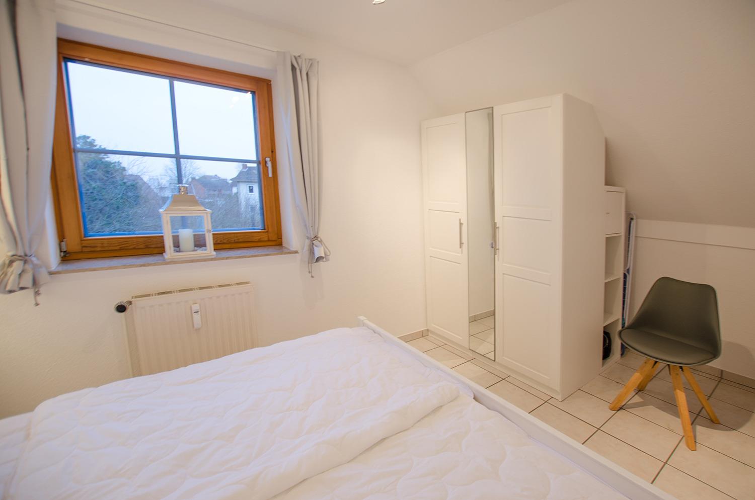 Im gemütlichen Schlafzimmer finden die Gäste ein großes Doppelbett mit einer Liegefläche von 180 x 200 sowie einen großen Einbau-Kleiderschrank, der genügend Platz für 4 Personen bietet.
