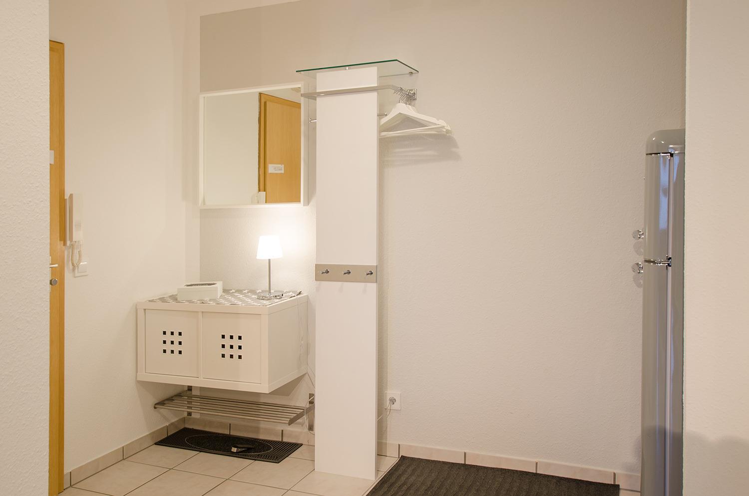 Sie betreten die freundliche und helle Wohnung und befinden sich direkt im großzügigen Flurbereich. Hier findet man genügend Platz, um auch bei schlechterem Wetter die Bekleidung und Schuhe unterzubringen.