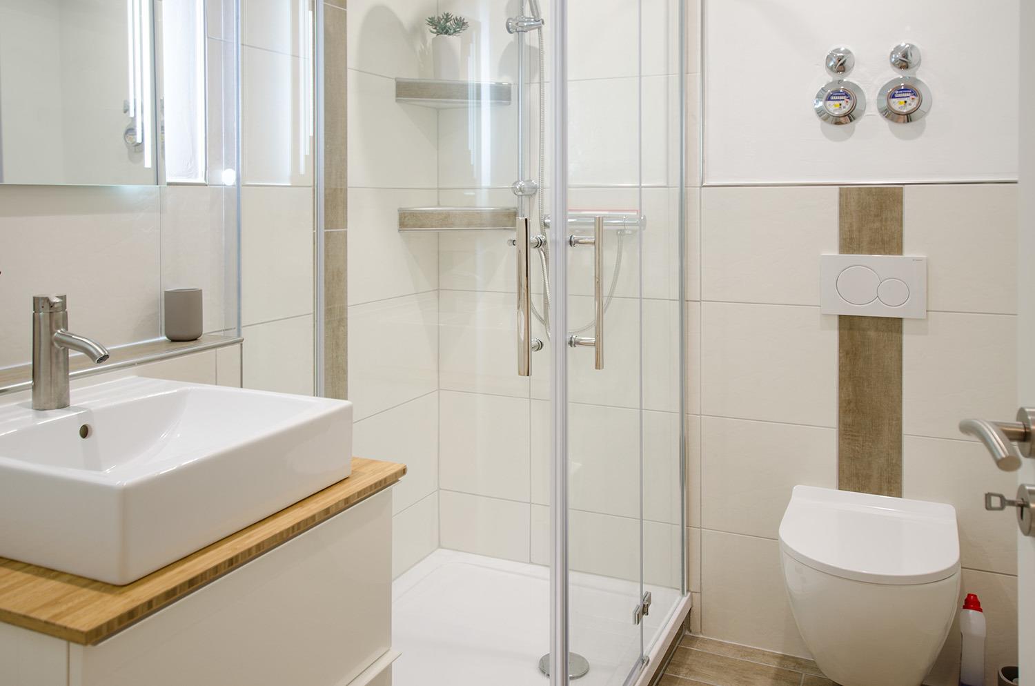 Das Bad besticht durch seine übergroße bodentiefe Dusche. Weiterhin findet man hier einen Waschtisch mit integriertem Schubladenunterschrank, das WC sowie einen Badheizkörper mit Handtuchwärmer.