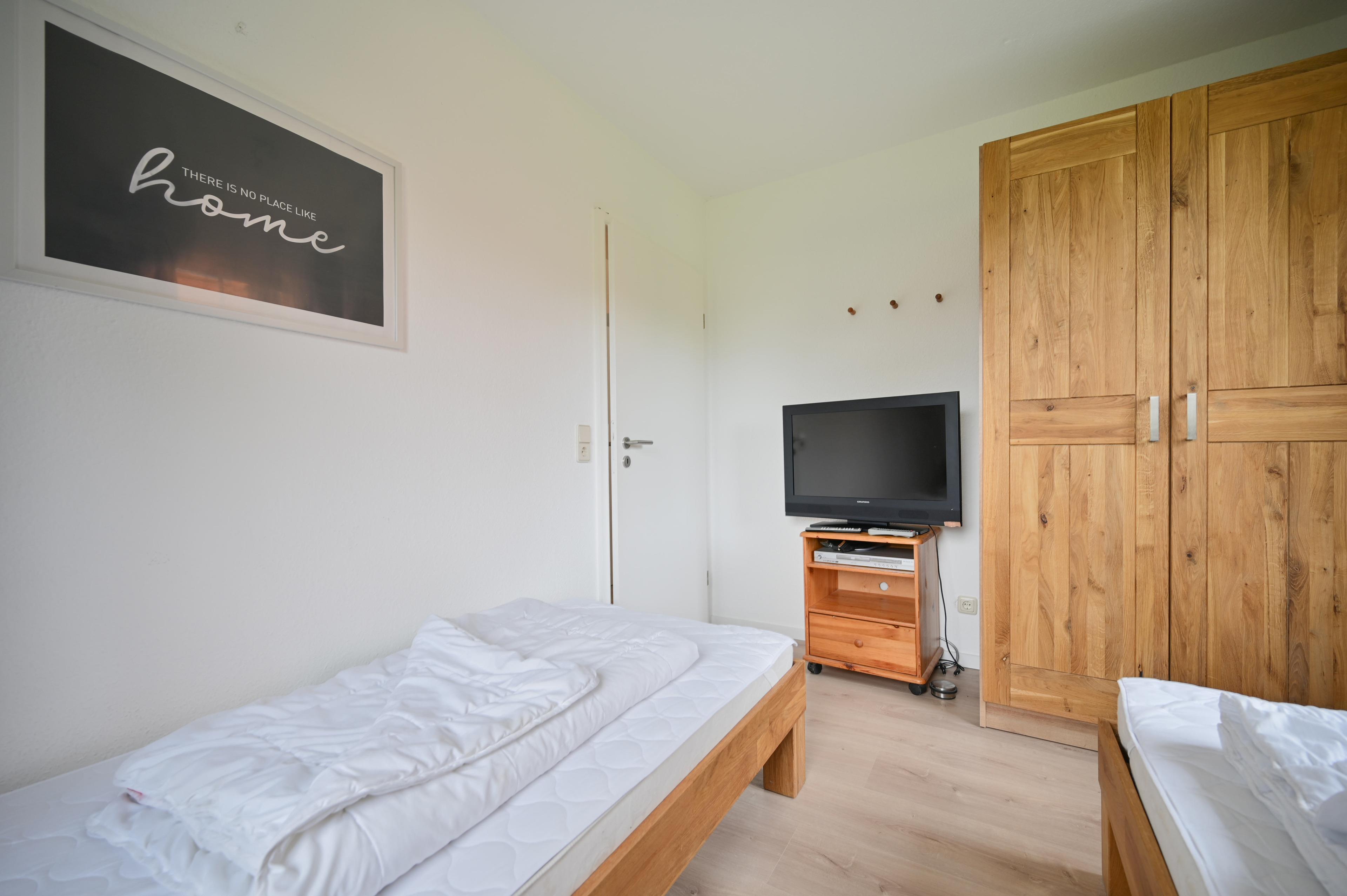 Im Kinderzimmer stehen zwei Einzelbetten ( 0,90m x 1,90m) mit einem Nachttisch. (hier steht ein zweiter TV, der über keinen TV-Empfang verfügt, dieser geht nur mit DVD Zugang und HDMI Zugang)