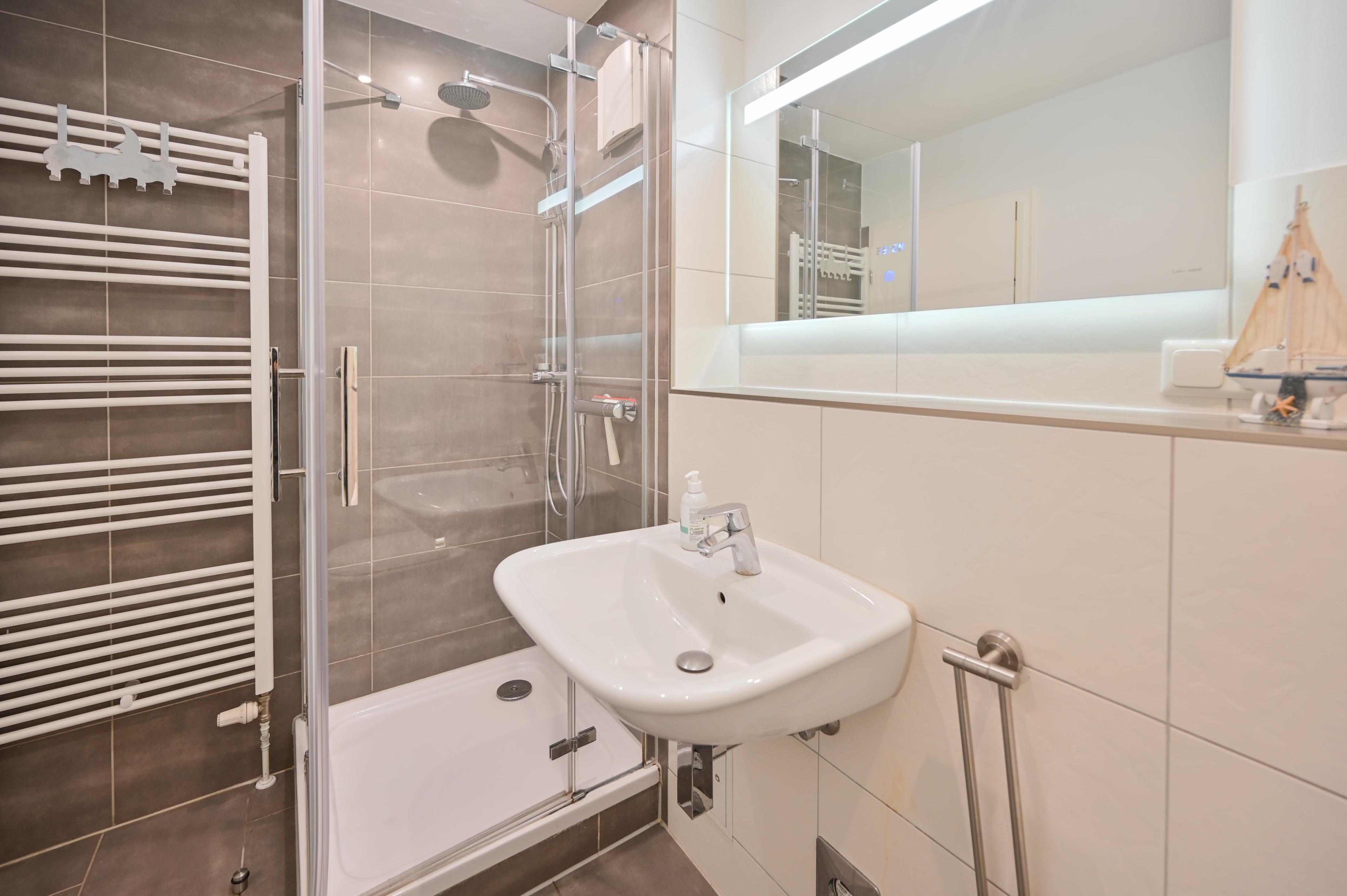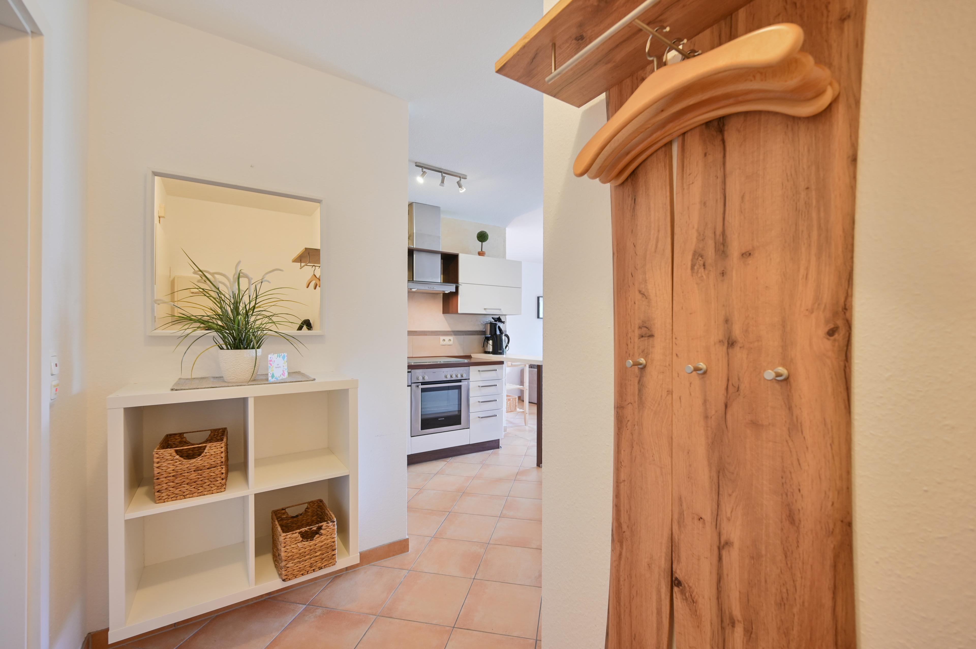 Die Diele verfügt über eine Garderobe, eine Kommode, ein Schuhregal und einen großem Spiegel. Außerdem befindet sich in der Wohnung ein Bad mit Dusche und WC. Im Gemeinschaftsraum des Hauses steht für Gäste eine Waschmaschine (Münzbetrieb) bereit.