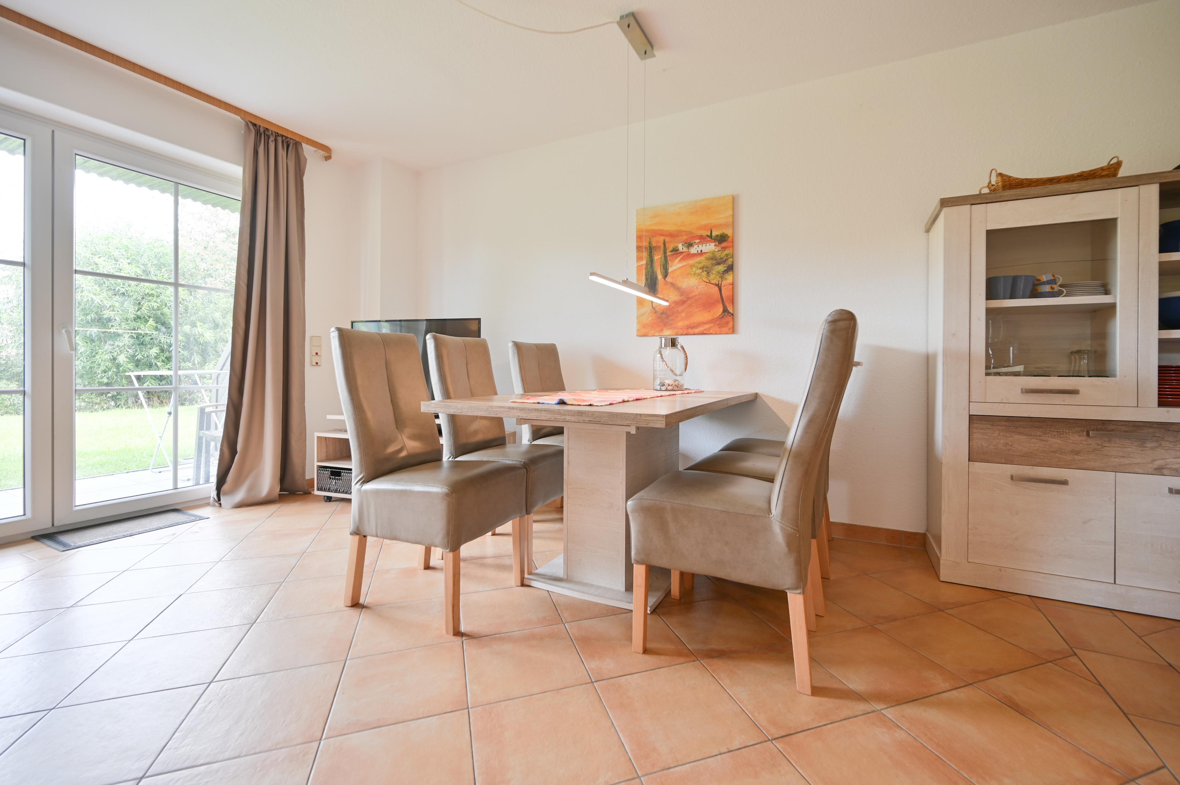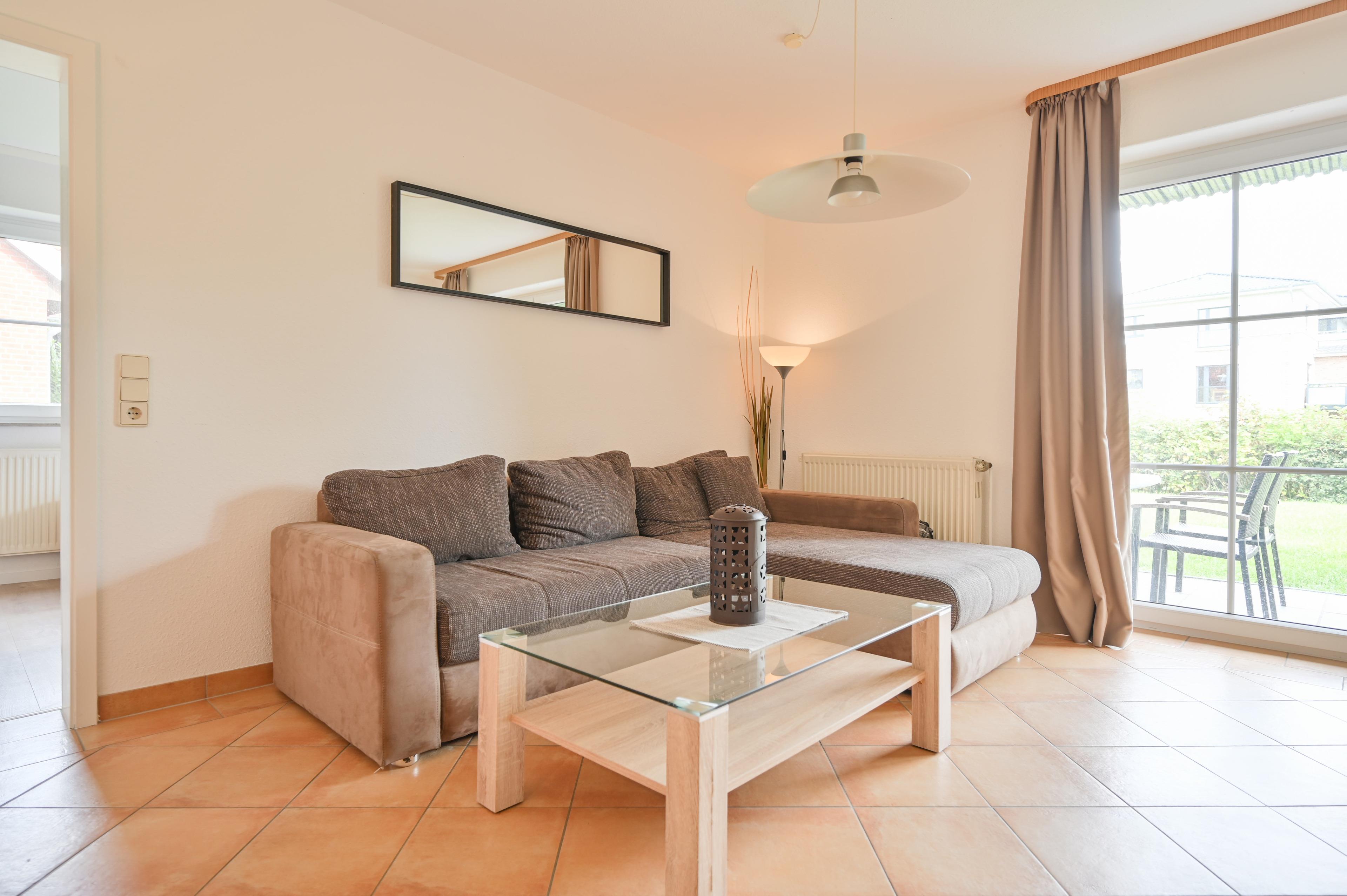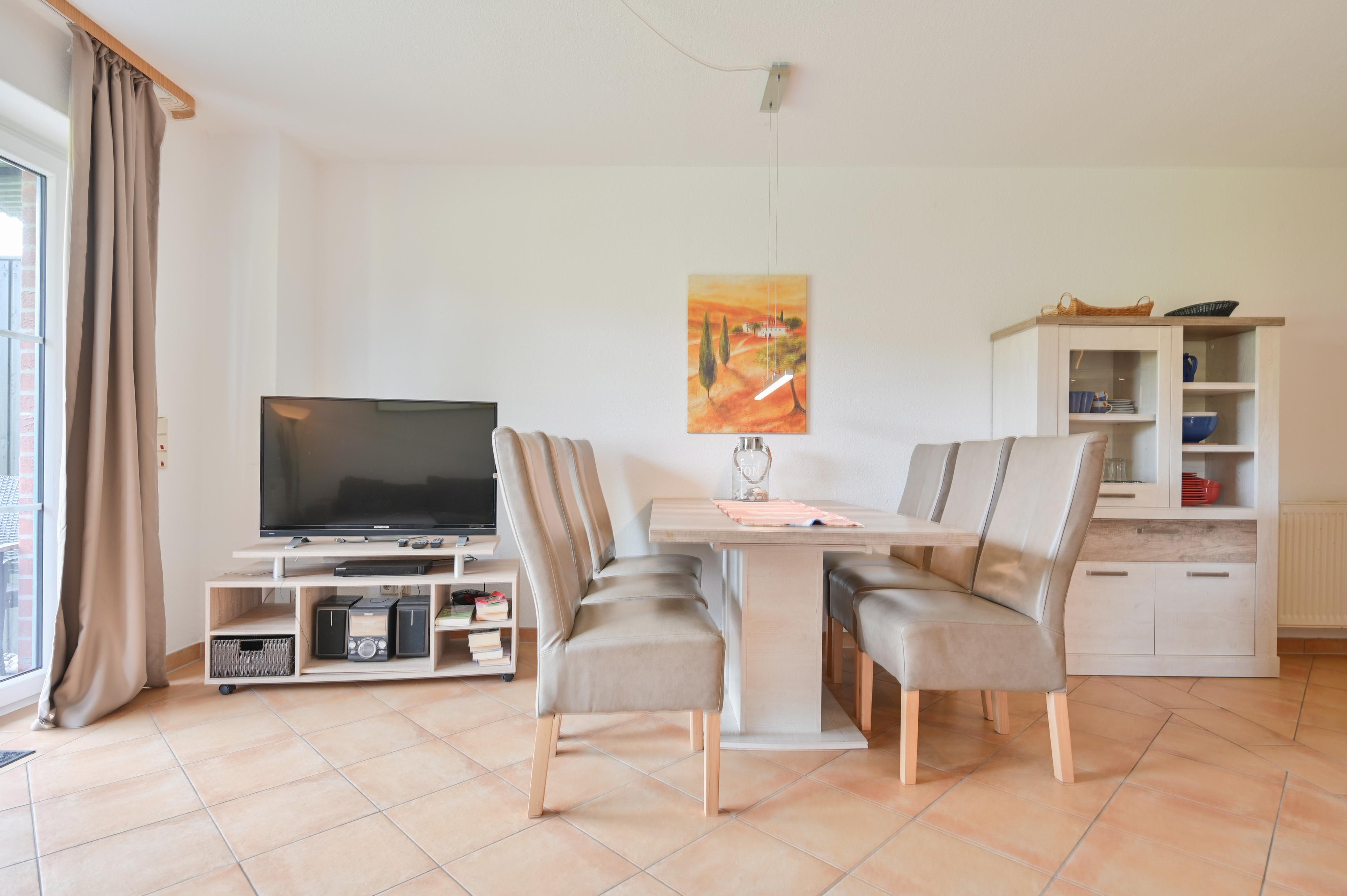 Das Wohnschlafzimmer ist ausgestattet mit einem Schlafsofa für zwei Personen, einem Couchtisch, einem Esstisch mit sechs Stühlen und zwei Vitrinenschränken. Von dem gemütlichen Zimmer aus haben Gäste Zutritt zur möblierten Terrasse, auf der man nach einem erlebnisreichen Tag am Strand noch ein wenig ausspannen kann.