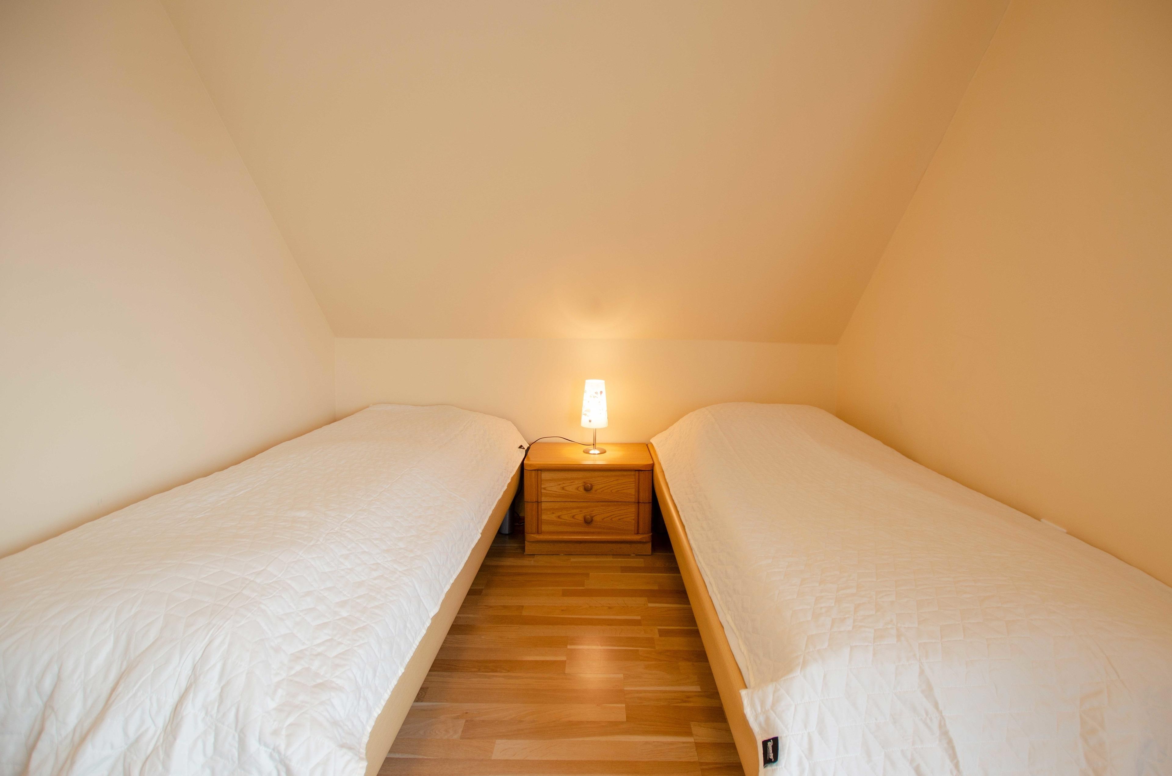 Desweiteren ein kleines separates Schlafzimmer mit zwei Einzelbetten. Und ein weiteres Schlafzimmer mit Einzelbetten, Sofa, Couchtisch und TV.