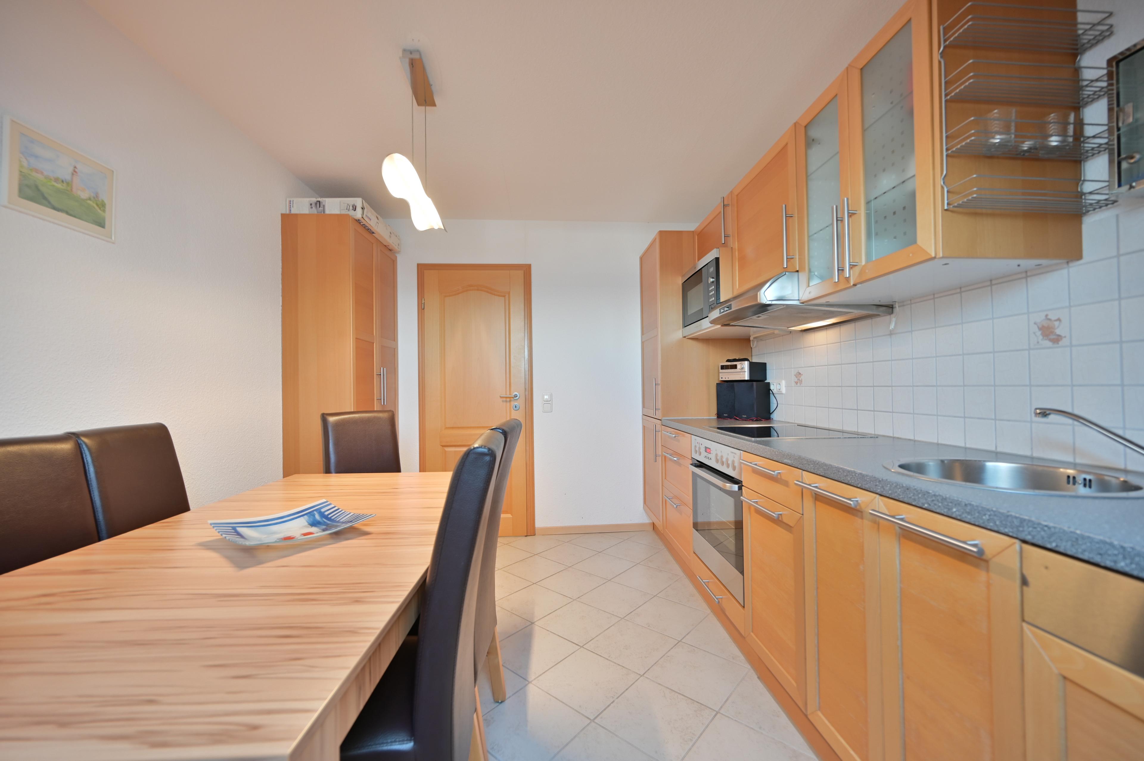 Außerdem gehören zur Ferienwohnung ein separates Schlafzimmer mit Doppelbett (160 x 200) und Kleiderschrank und ein weiteres separates Schlafzimmer mit zwei Einzelbetten (90 x 200) und Kleiderschrank. Darüber hinaus verfügt das Appartement über ein Badezimmer mit Badewanne, Dusche, Waschbecken und Waschmaschine und ein weiteres Bad mit Dusche/WC sowie eine Wohnküche mit Esstisch und 6 Stühlen.