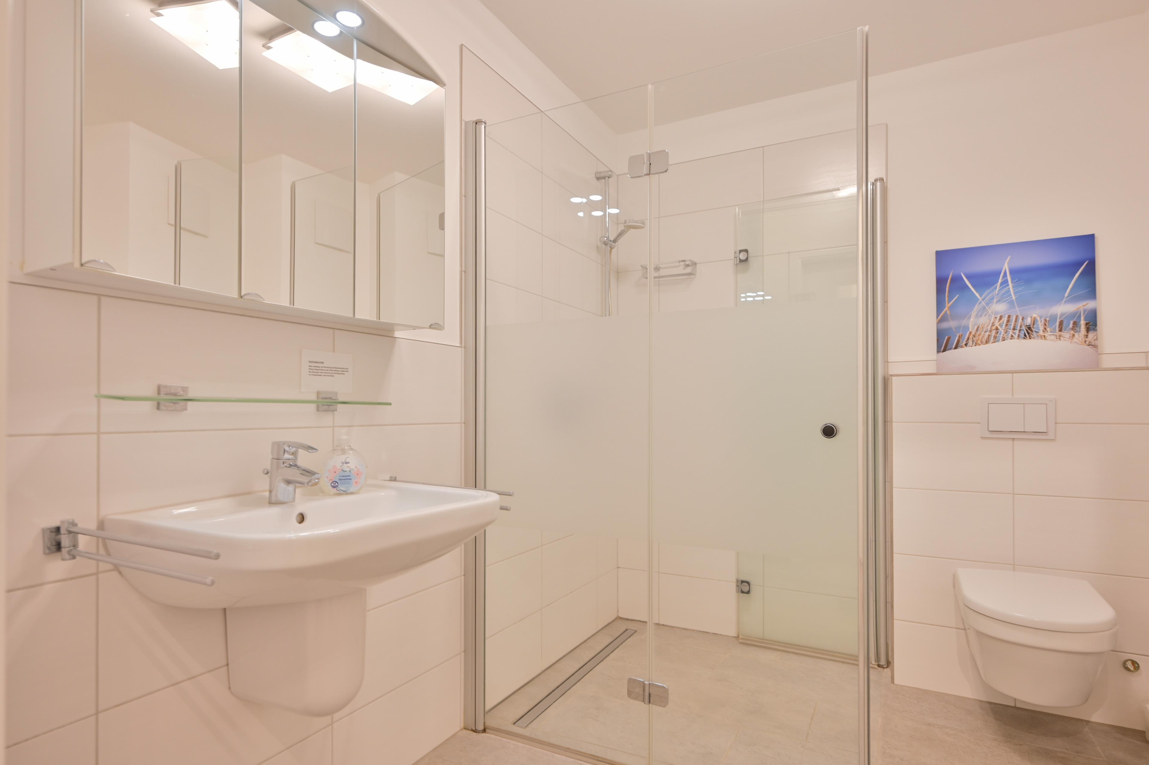Das Badezimmer ist mit einer Dusche, WC, Spiegelschrank