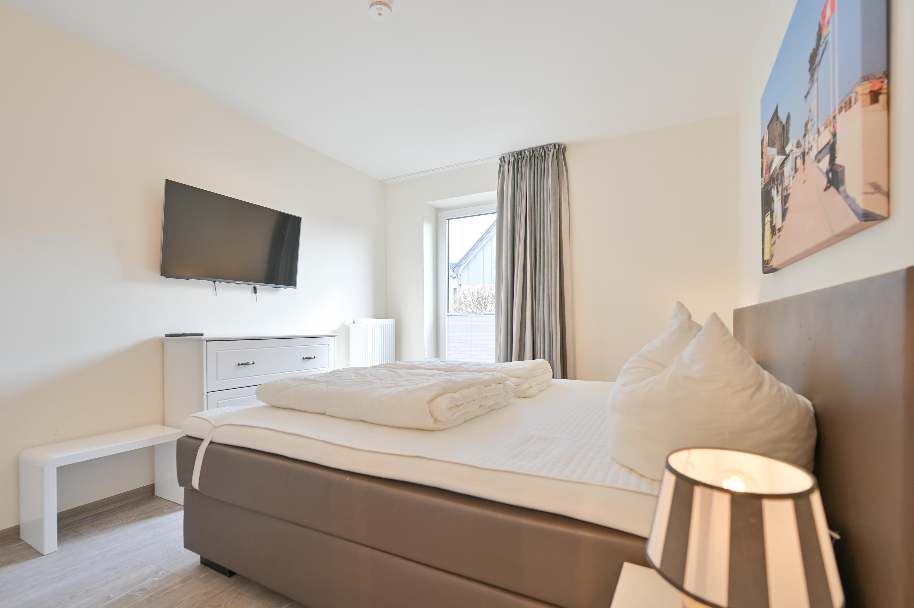 Im Schlafraum befinden sich außerdem ein zweites großes TV-Gerät und ein großer Kleiderschrank.