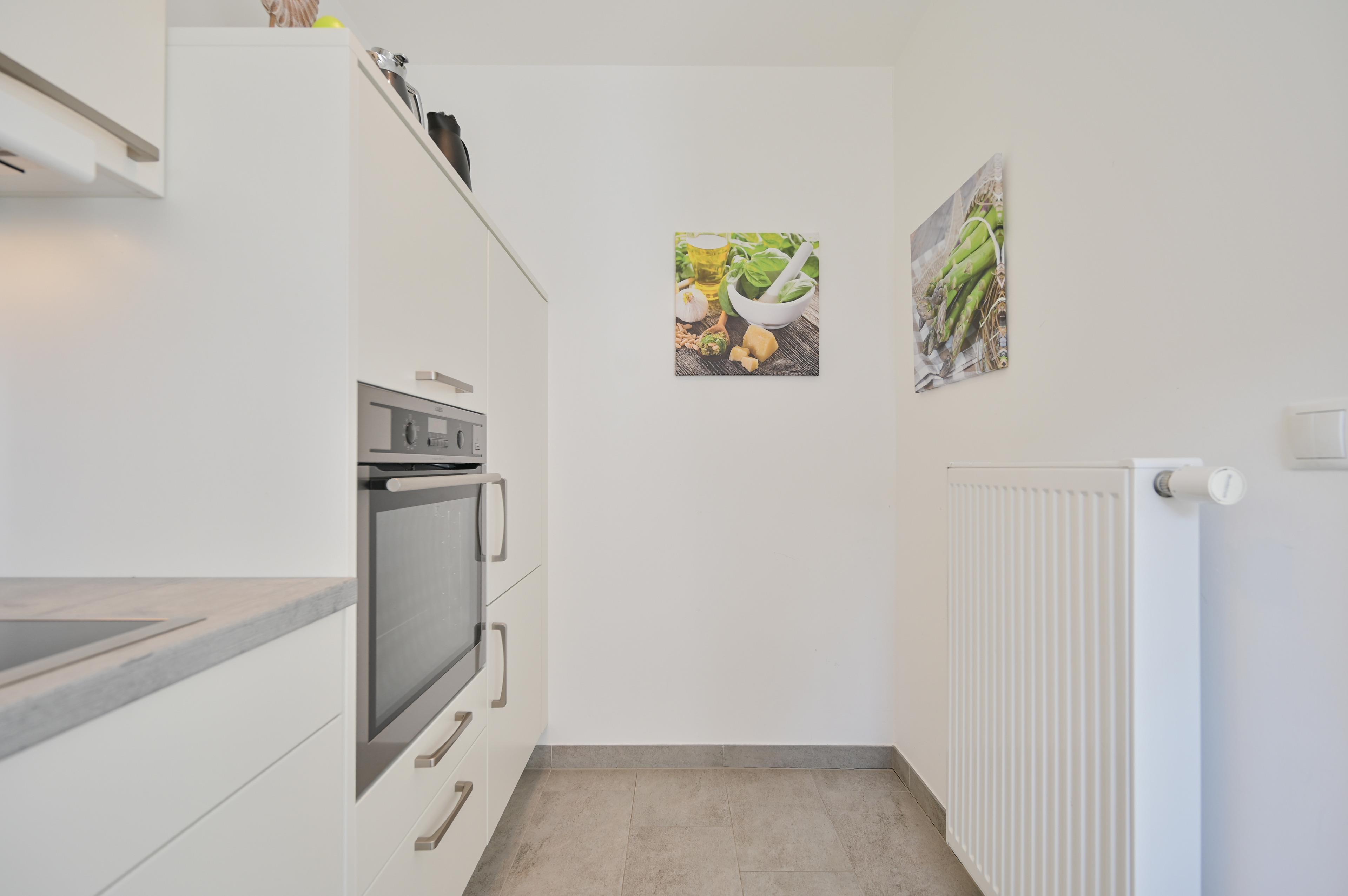 Die Küche verfügt über ein Cerankochfeld, einen Herd, eine Spülmaschine, eine Mikrowelle, eine Kaffeemaschine und einen Kühlschrank mit Gefrierfach.