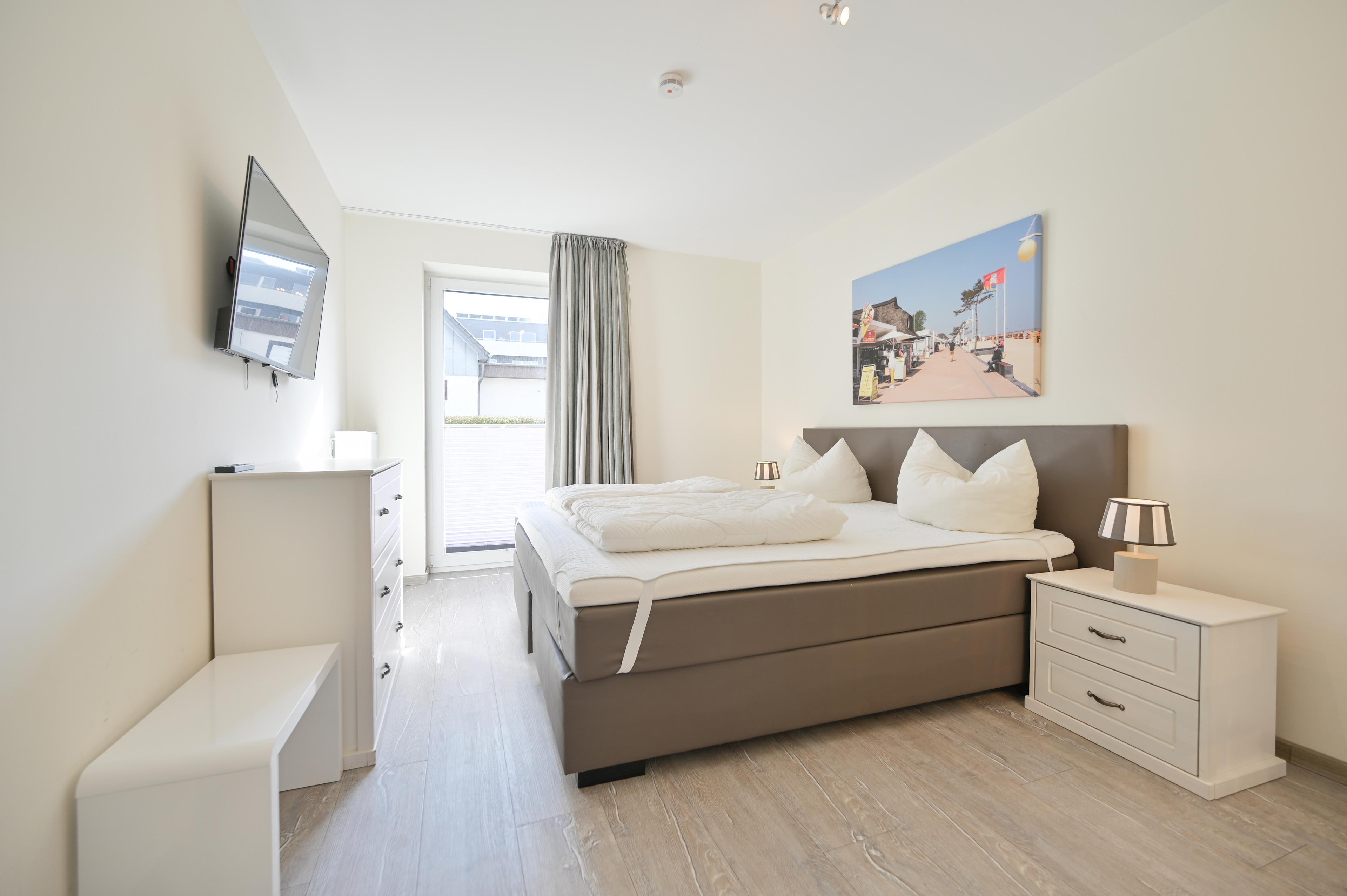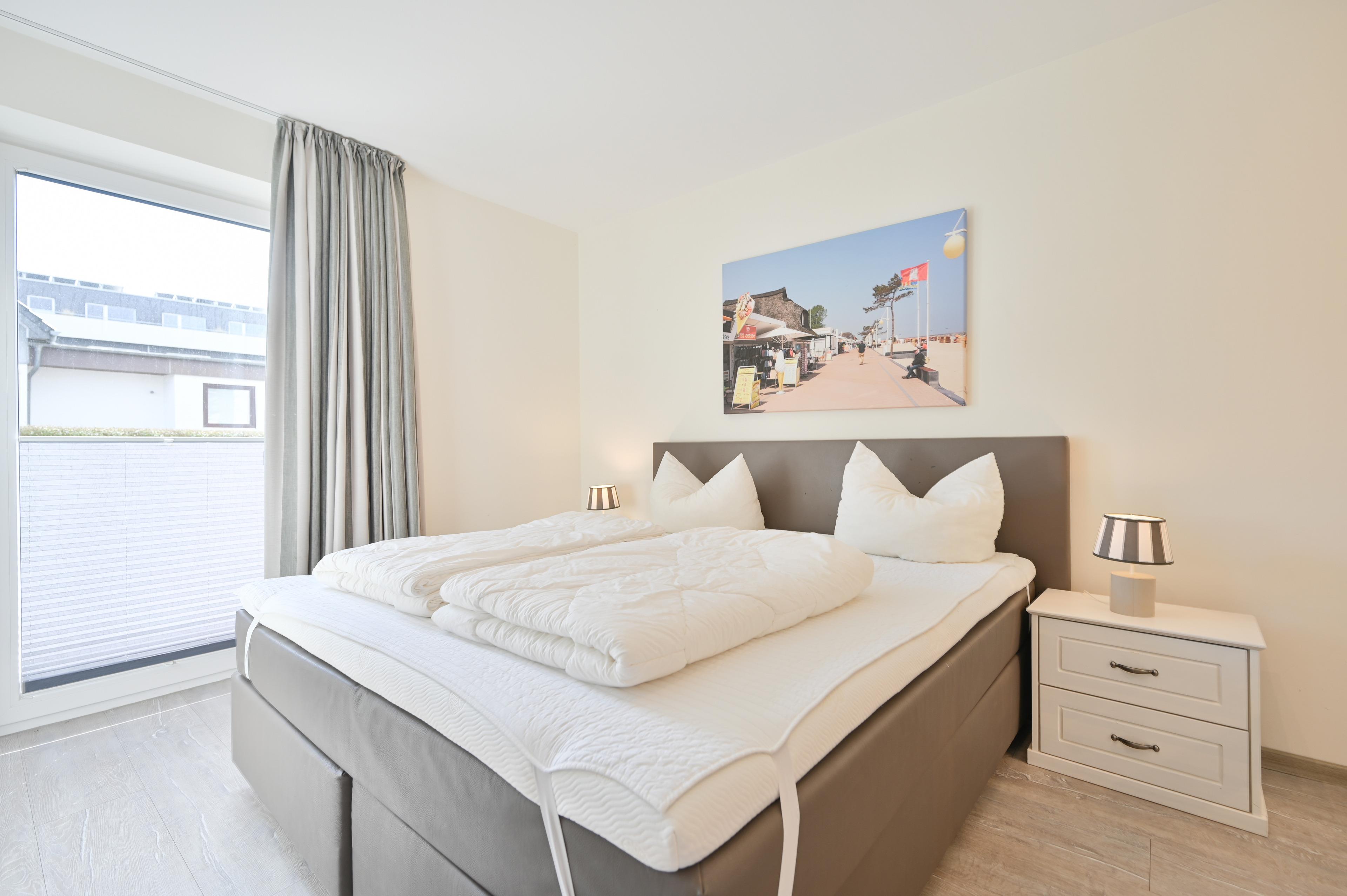 Das separate Schlafzimmer verfügt über ein bequemes Doppelbett (Boxspringbett B:180cm mit durchgehendem Topper) und Nachttischchen mit Leselampen.