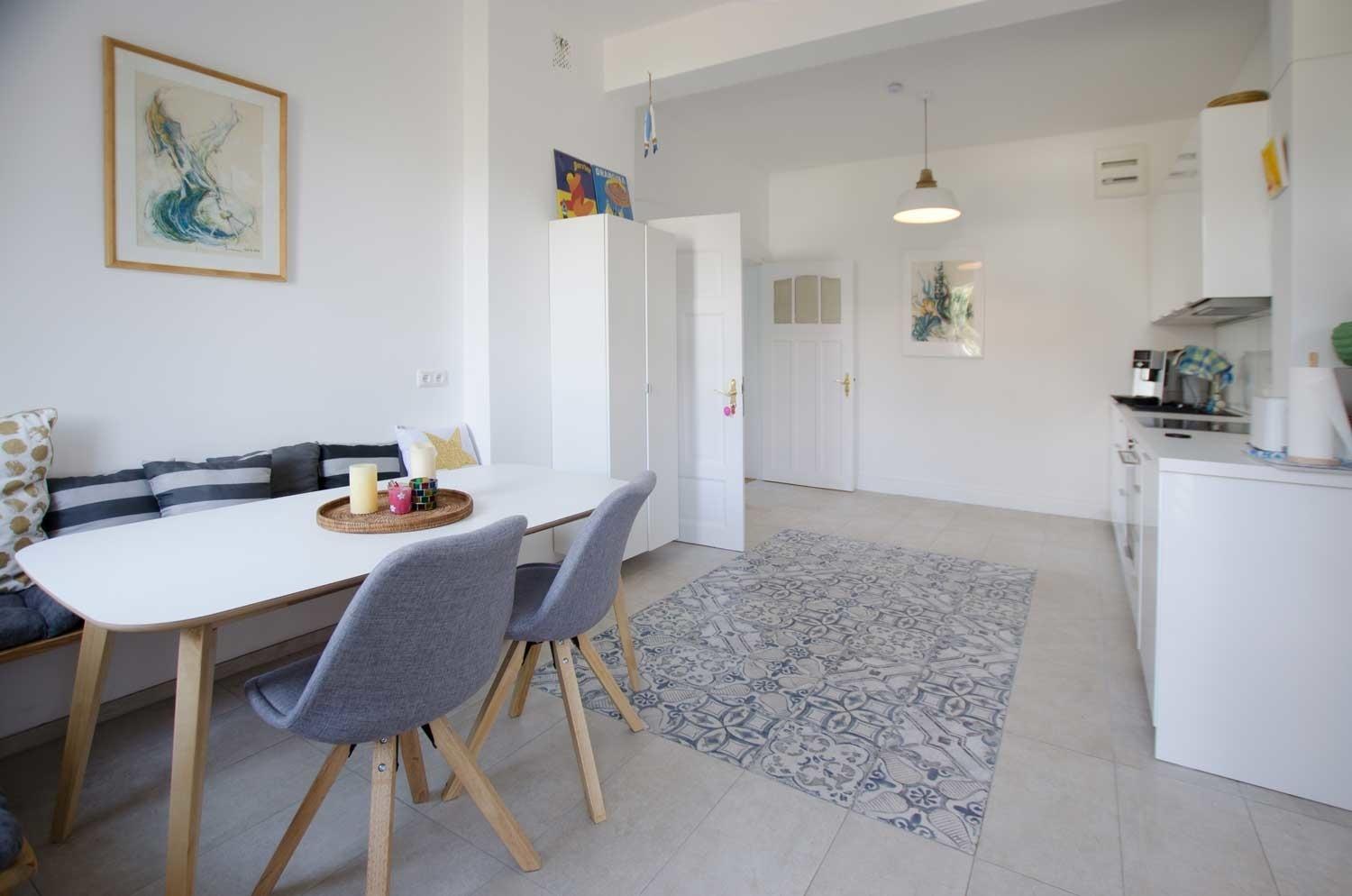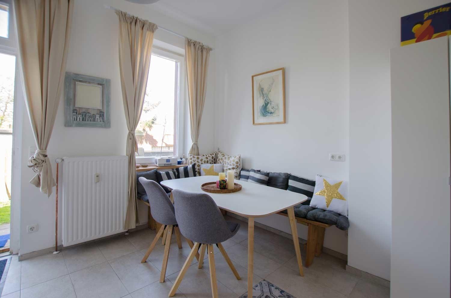 Die große Wohnküche bietet eine helle, geräumige Essecke mit Eckbank und Stühlen. Die Küchenzeile ist für den Ostseeurlaub gut ausgestattet sodass es in den Ferien an nichts fehlt.