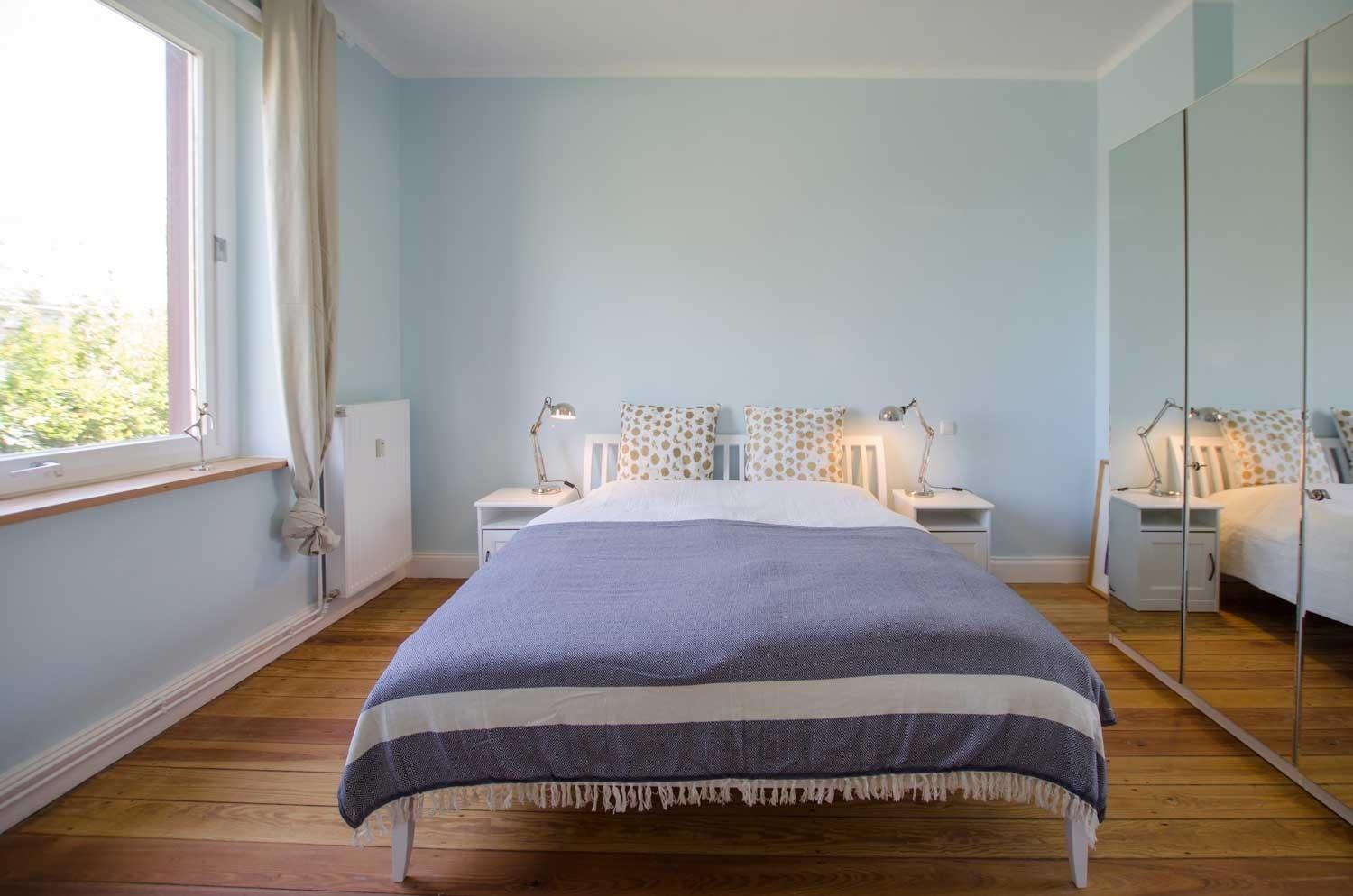 Im Schlafraum befindet sich ein Doppelbett mit Nachttischen, Leseleuchten, sowie ein Kleiderschrank, das Fenster ist mit Verdunklungsrollo ausgestattet.