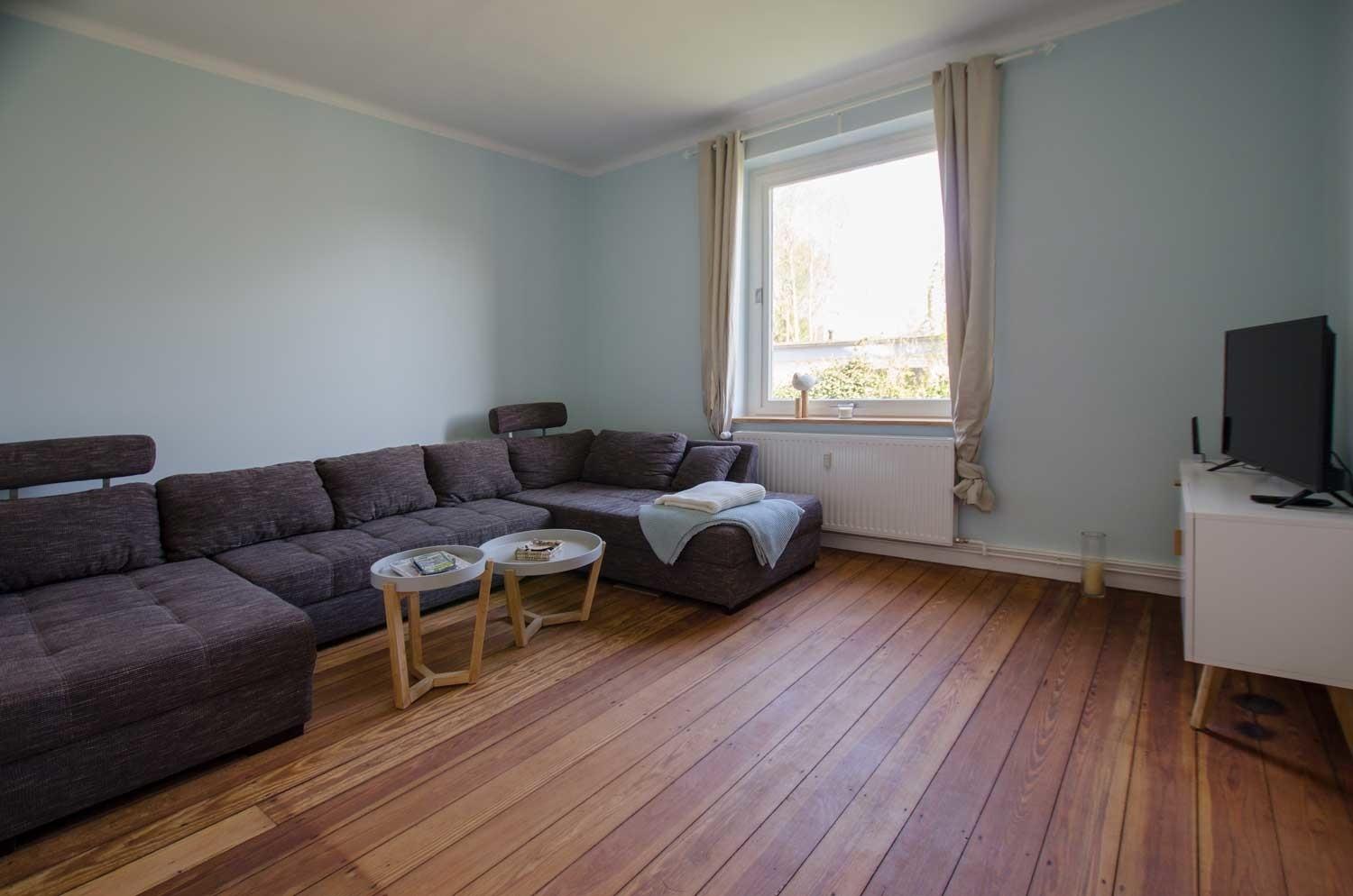 Das Wohnzimmer der Fewo ist mit einer bequemen Sofalandschaft (mit Schlaffunktion "bis zu 3 Personen") eingerichtet.