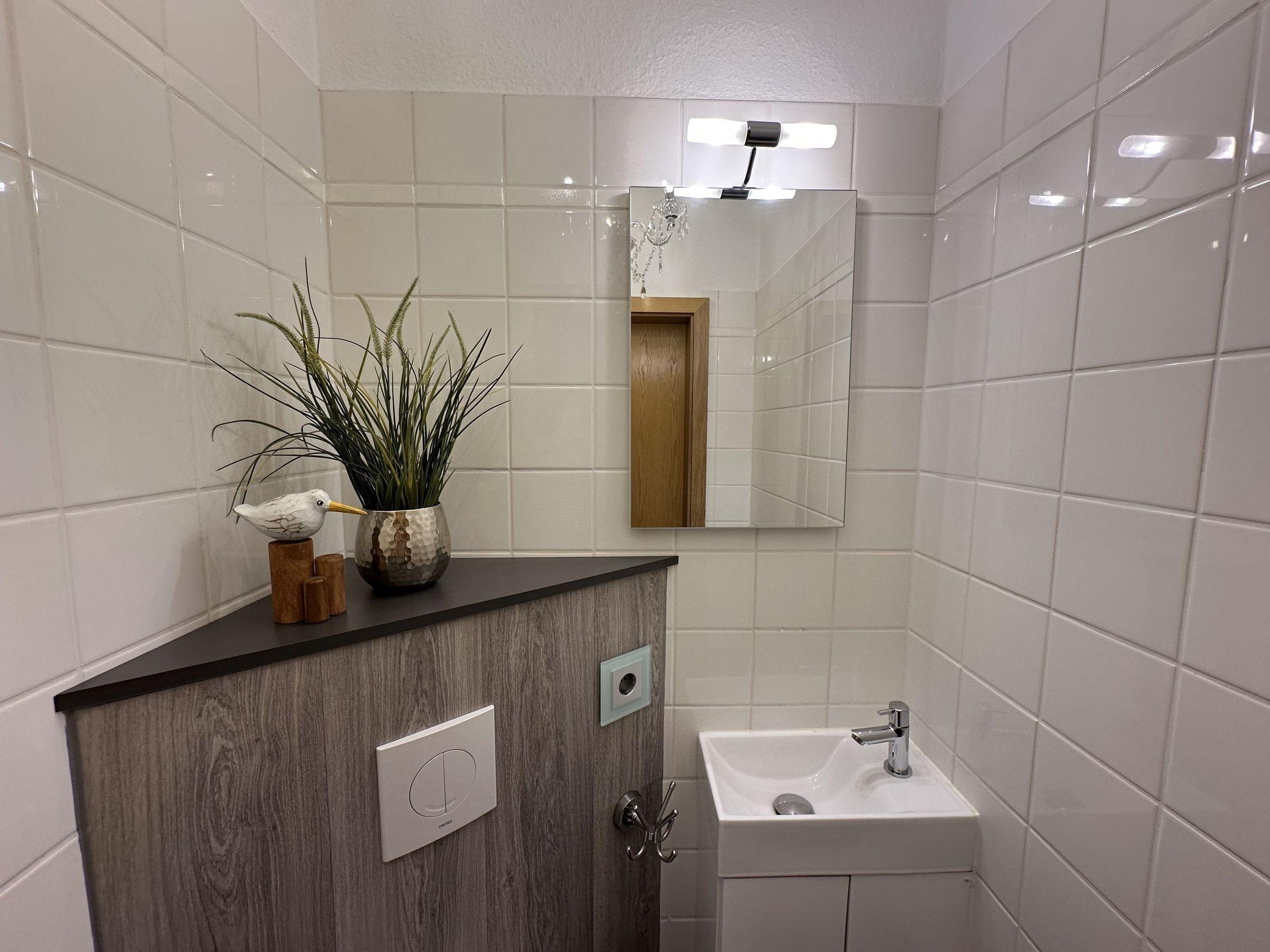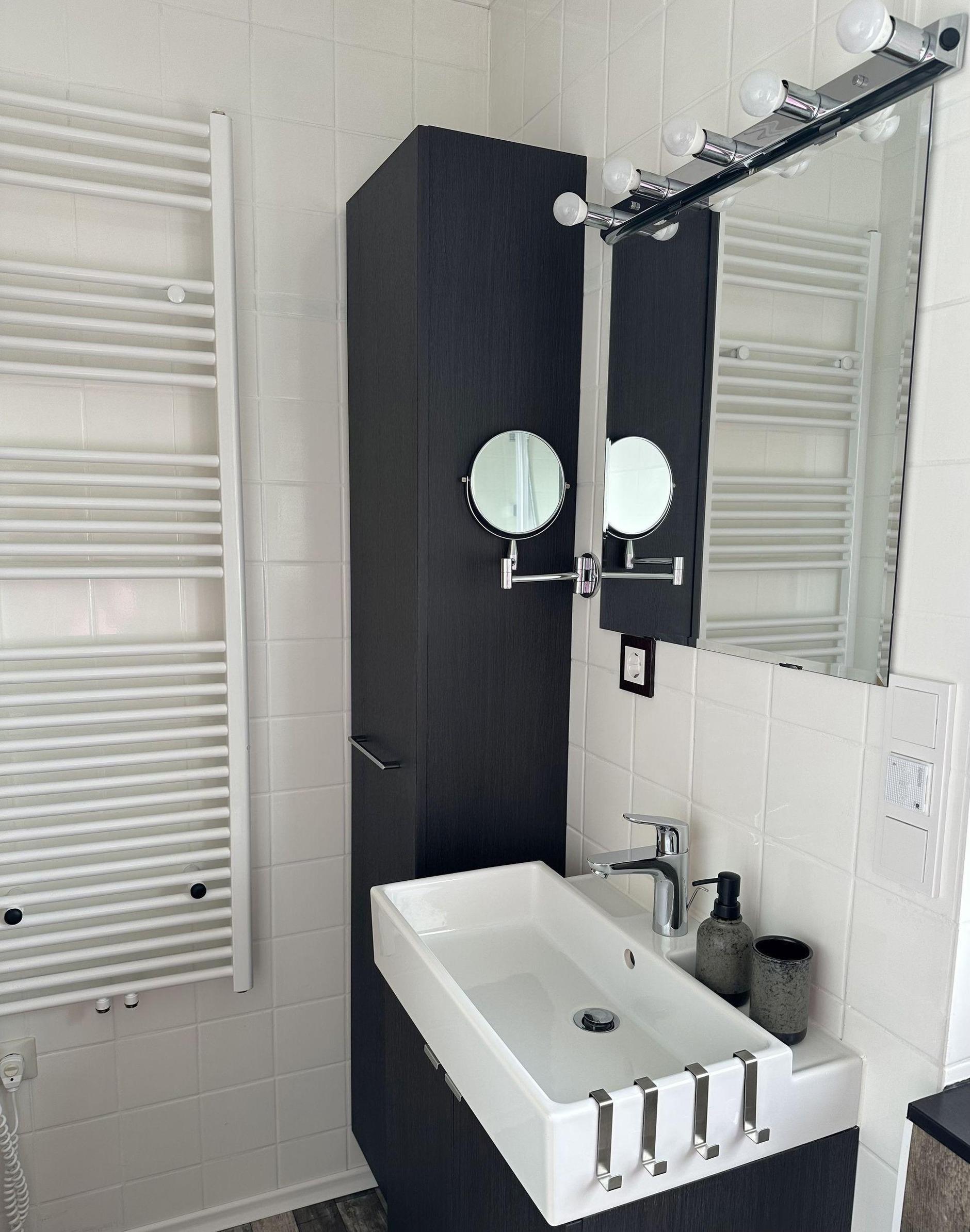 Ein kleines, aber feines Badezimmer mit Dusche, WC, Waschtisch, Wandhandtuchheizkörper, einem geräumigen Schrank für Kosmetika und Fußbodenheizung.