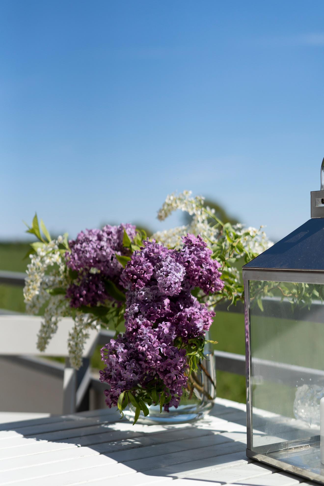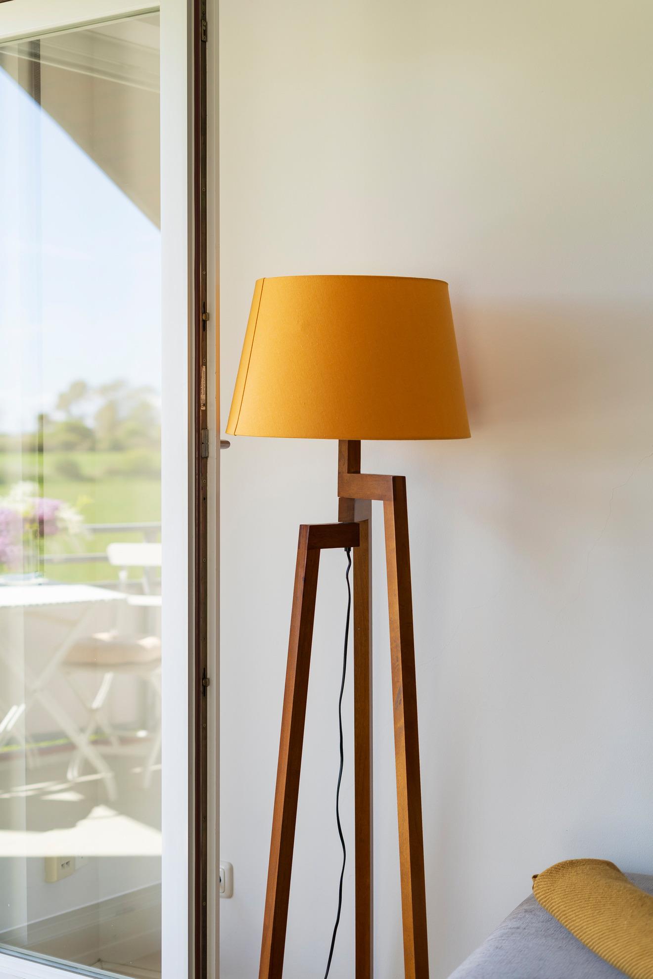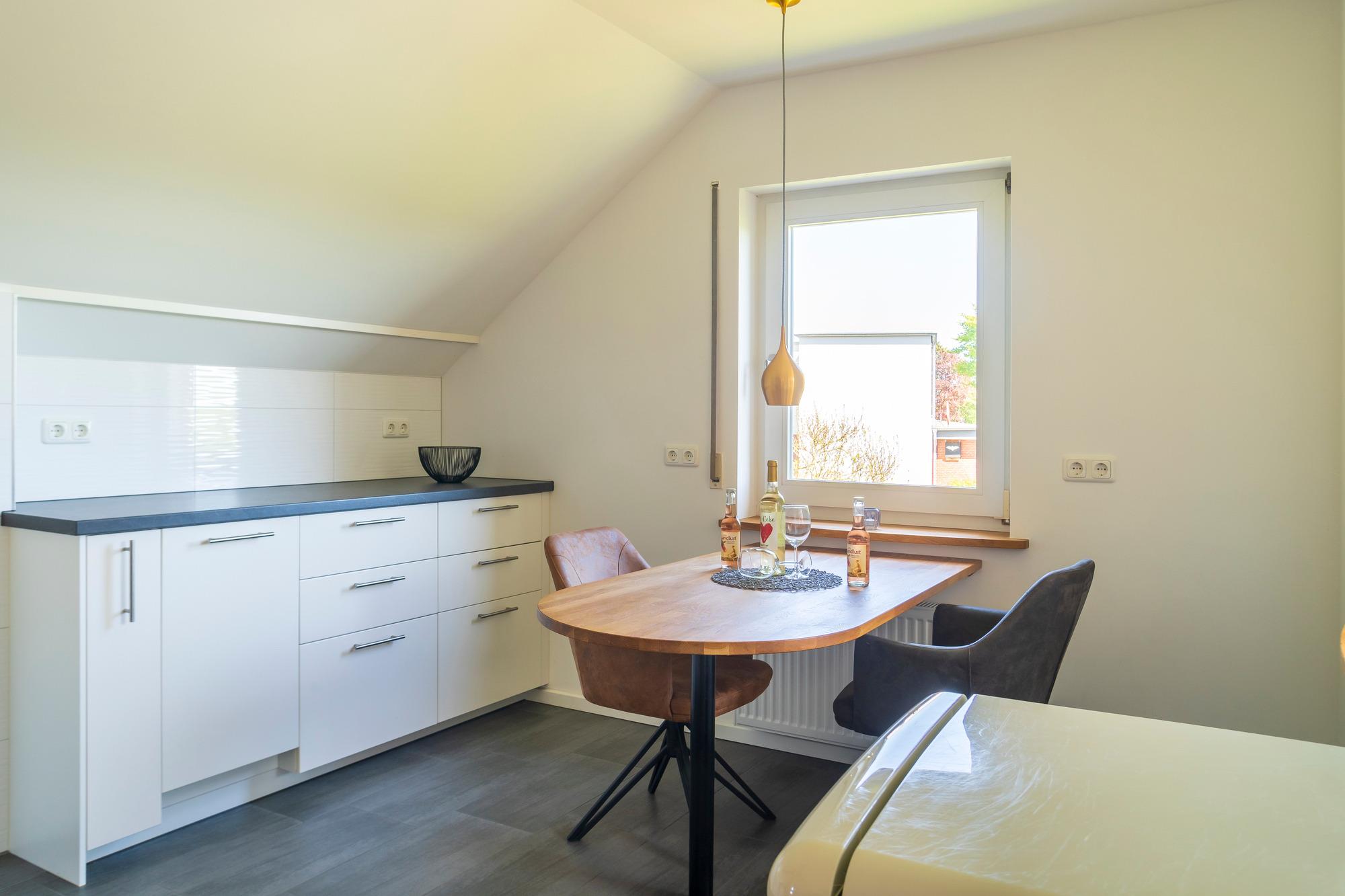 Der Sitzplatz in der Küche mit dem halbrunden Tisch aus massiver, pflanzlich geölter Eiche und den beiden gemütlichen Lounge-Sesseln bietet in den laubfreien Jahreszeiten einen schönen Blick über das Land bis zur Ostsee. Im Sommer blühen Kletterrosen direkt vor dem Fenster. Der zweite Sitzplatz im Wohnbereich hat einen „Überraschungssessel“ aus kurkumafarbenem Leder und eine Chaiselongue mit edlem Stoffbezug, elektrisch zu verstellender Sitzbreite und Ausrichtung zur großen Balkontür mit Blick bis zum Leuchtturm Dahmeshöved. Auch an Freunde von Tresenstühlen wurde in der Küche gedacht.