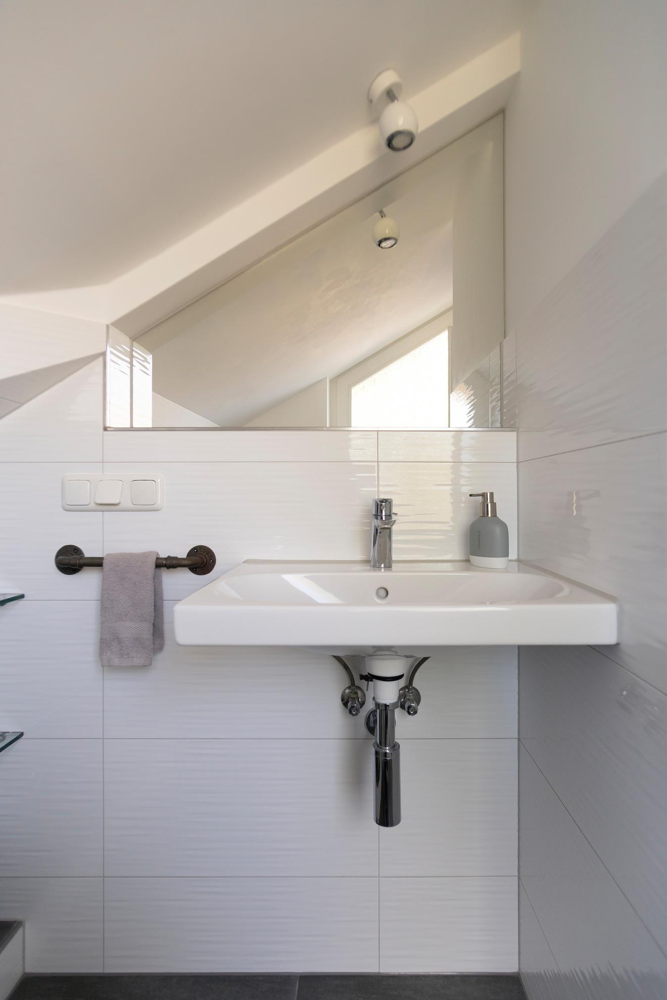 Im kleinen Badezimmer konnte durch die Nutzung der Abseite für ein Regal mit zwei massiven Glasböden, dem angepassten dreieckigen Spiegel am Waschbecken und der emaillierten, ultraflachen Duschtasse (90 x 120 cm) der zur Verfügung stehende Platz optimal ausgenutzt werden. Die Glasregale werden durch in die Fliesen eingelassene LED-Stripes betont. Harmonisch hell wird das Bad durch drei Einbaustrahler in der Decke und einen separat zu schaltenden Spot am Spiegel. Das Bad hat ein dreieckiges Fenster mit lichtdurchlässigem Ornamantglas.