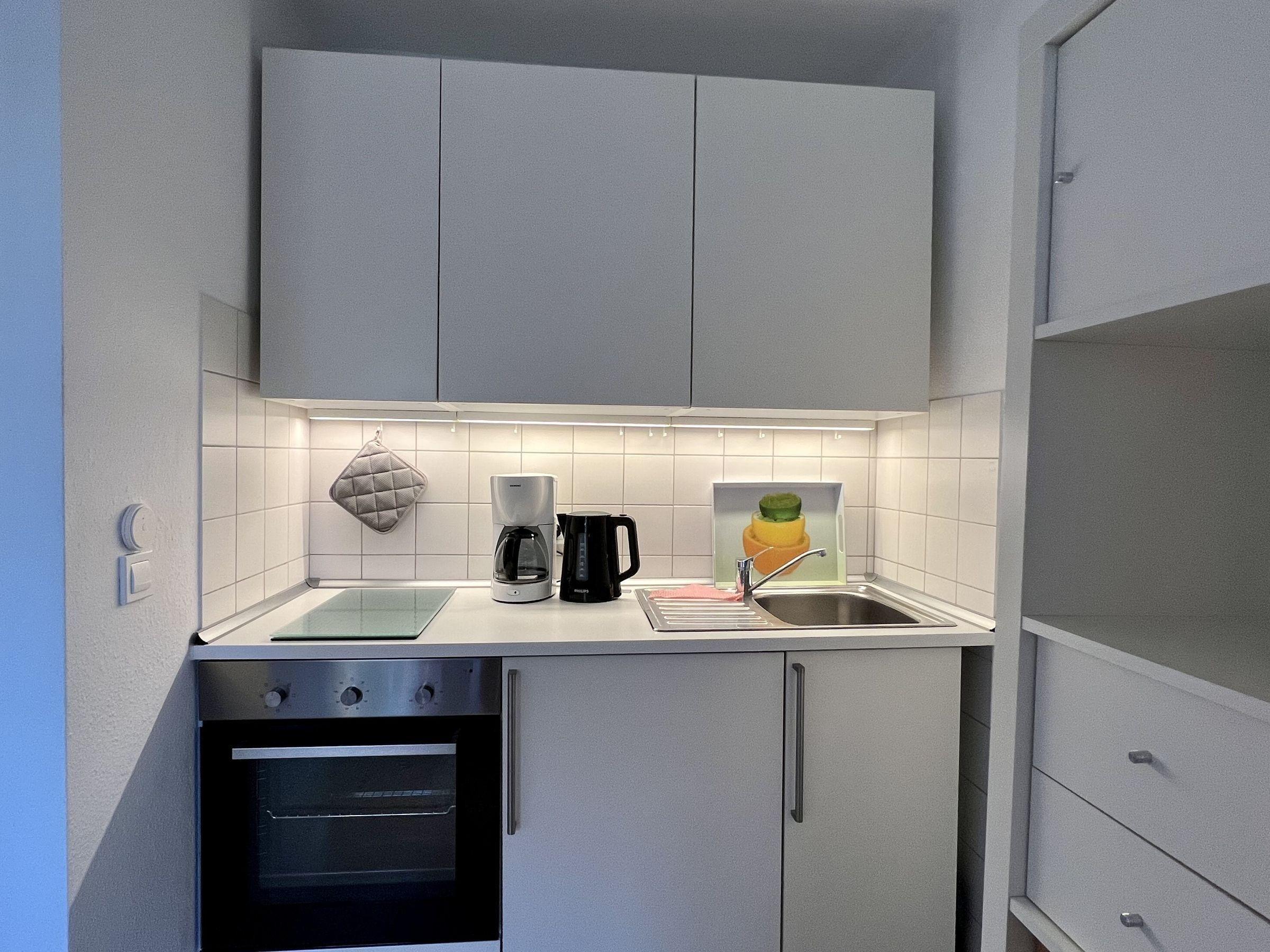 Küchenzeile voll ausgestattet mit Backofen, 2 Platten-Ceranherd, Kühlschrank m. Gefrierfach, etc.,