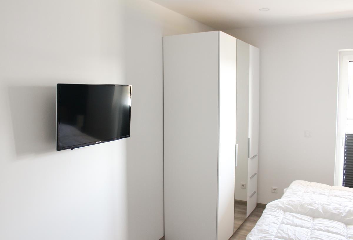 Im Tageslichtbad Sie eine helle und freundliche Atomsphäre mit einer bodengleichen Dusche und einem WC. In einem Abstellraum steht eine Waschmaschine zur kostenlosen Nutzung bereit. Im Elternschlafzimmer erwartet Sie ein Doppelbett und ein zweiter TV. Für unsere ganz kleinen Gäste haben wir ein festes Kinderbett vorhanden. Innerhalb der gesamten Wohnung ist kostenloses WLAN sowie eine vorhanden.