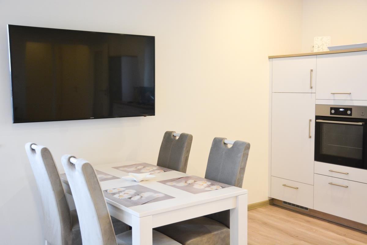 Die Wohnung 6 befindet sich im 2. Obergeschoss zur rechten Seite und verfügt über 53 Quadratmeter reine Wohnfläche. Der Wohn- Essbereich wird durch eine sehr moderne Küchenzeile hervorgehoben. Eine Sitzecke mit Smart TV lädt Sie zum Entspannen ein. Gemeinsame Stunden können in der Essecke an einem Esstisch verbracht werden.