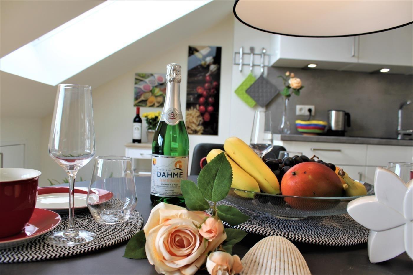 Die hochwertige Ferienwohnung Muschelhus in Dahme liegt idyllisch nahe dem Ostseestrand und bietet Sauna, Balkon und moderne Ausstattung.