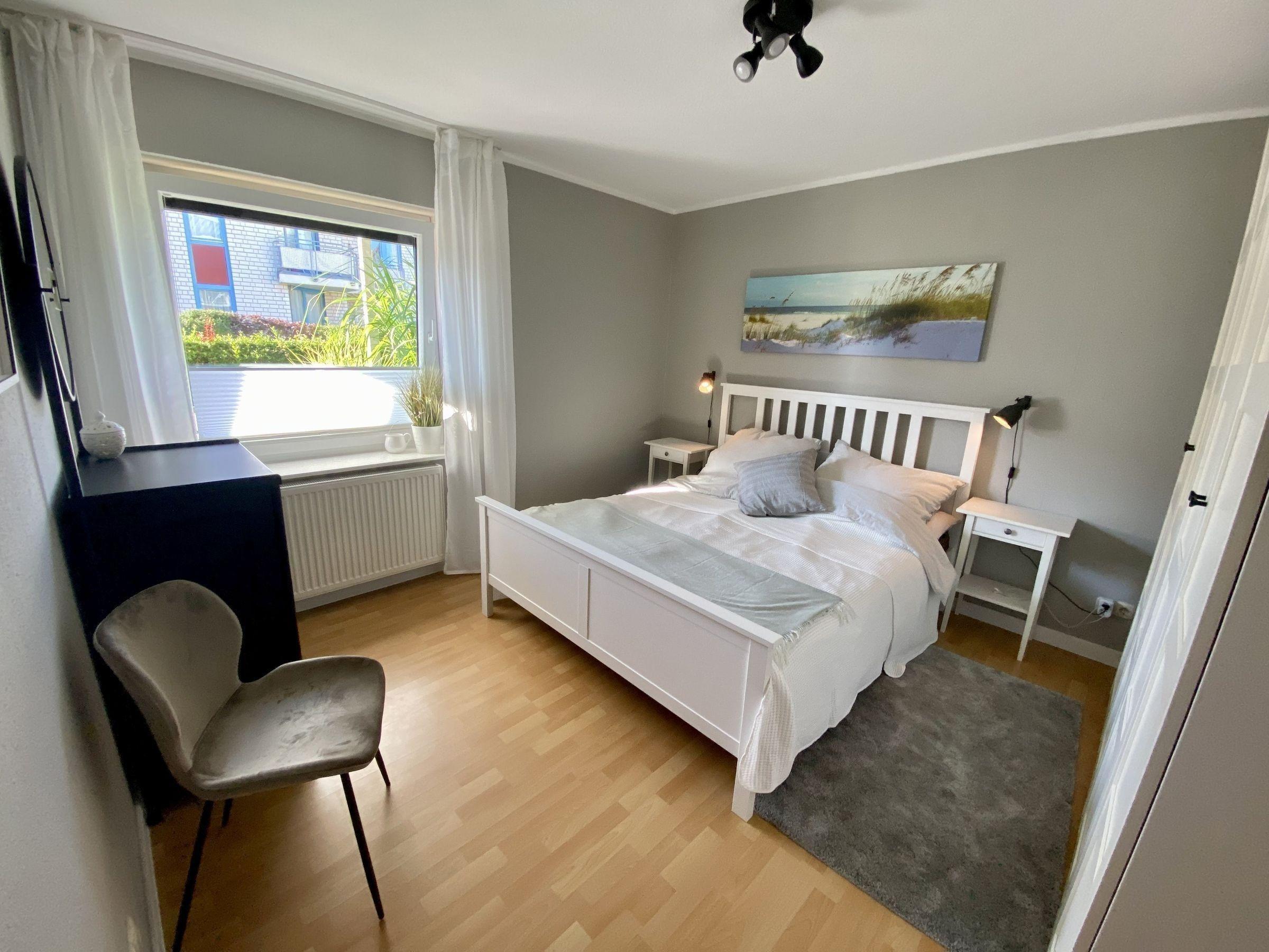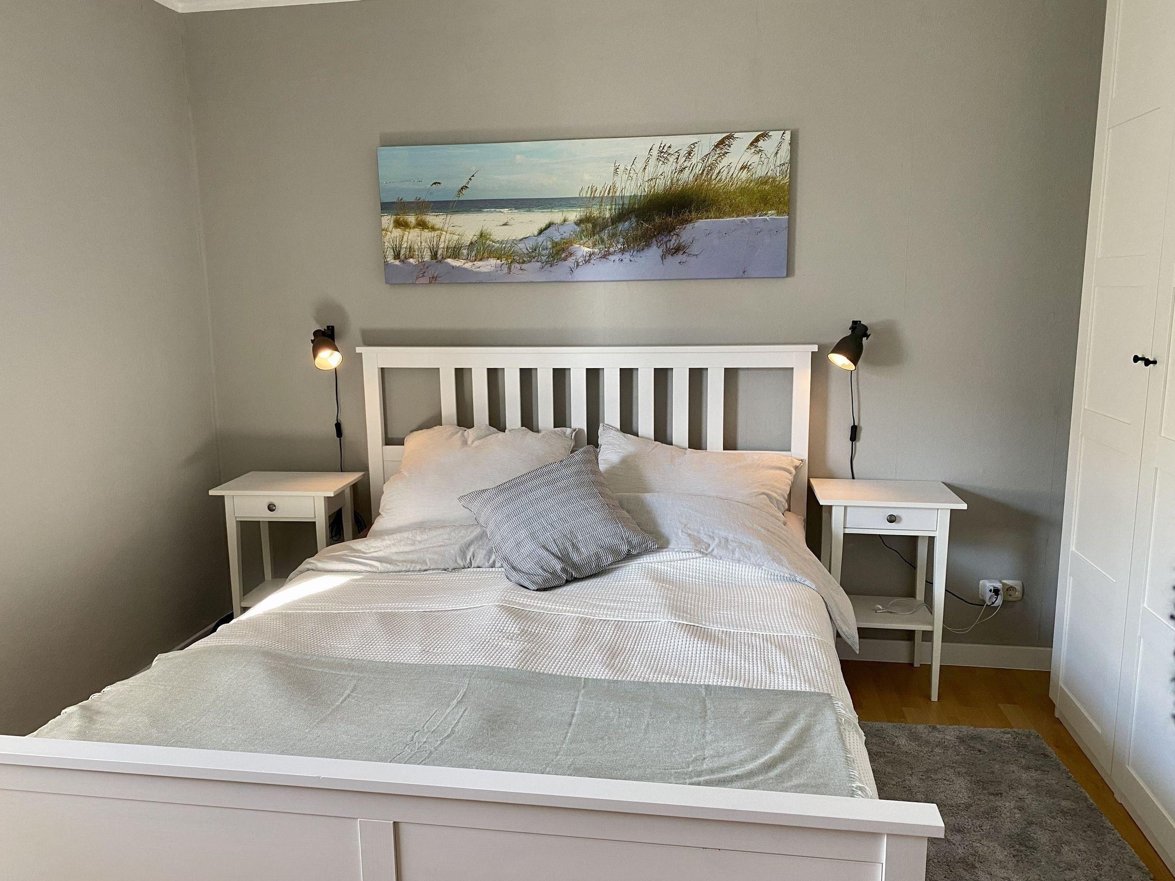 - ein großes helles Schlafzimmer mit großem Kleiderschrank und einem Doppelbett 160 x 200 m und Platz für ein Kinderreisebett