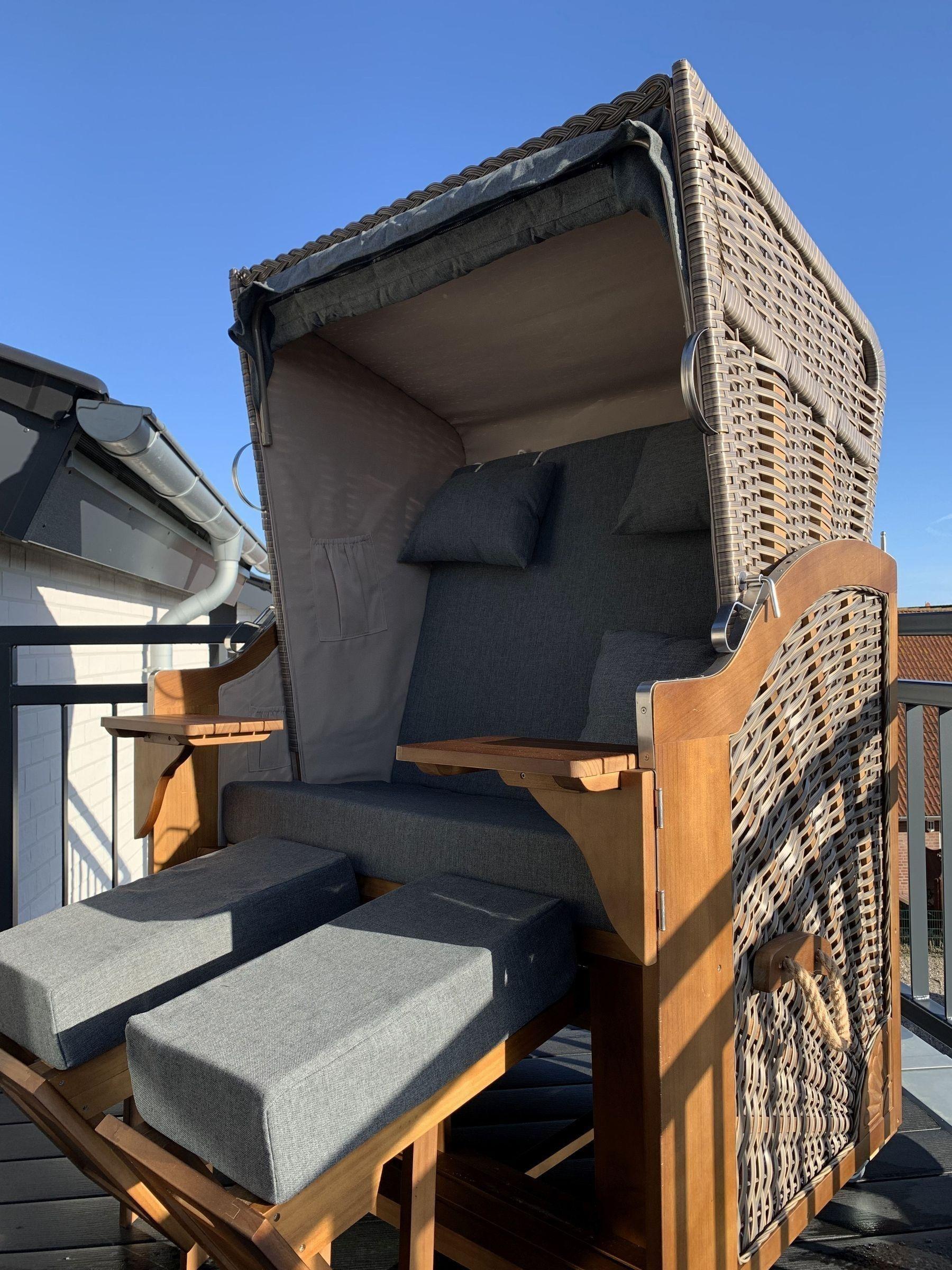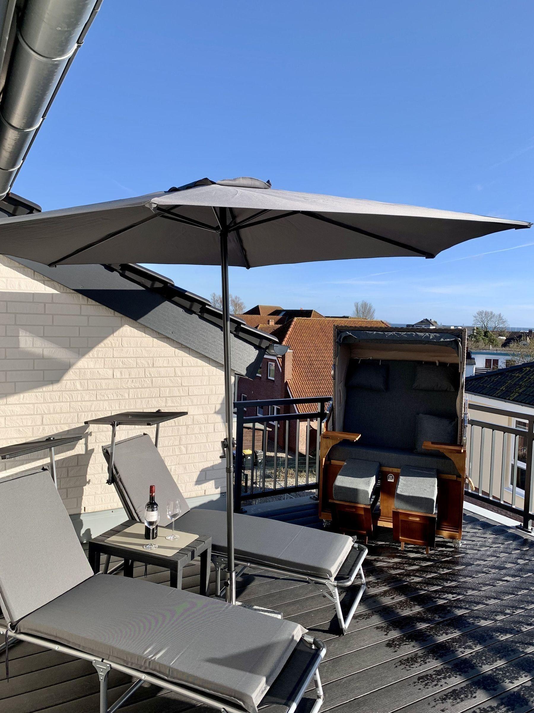 - große Loggia/Balkon (Ausrichtung Süd/Ost) mit Sonnenliegen, Tisch, Stühlen und Sonnenschirm