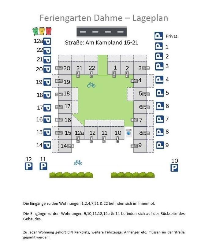 Die Wohnung befindet sich in angenehmer Umgebung mit einer schönen Gartenanlage. Der windgeschützte Innenhof lädt zum Entspannen ein. Jede Wohnung hat ihren eigenen Pkw-Stellplatz. Zwei Fahrradständer sind vorhanden.