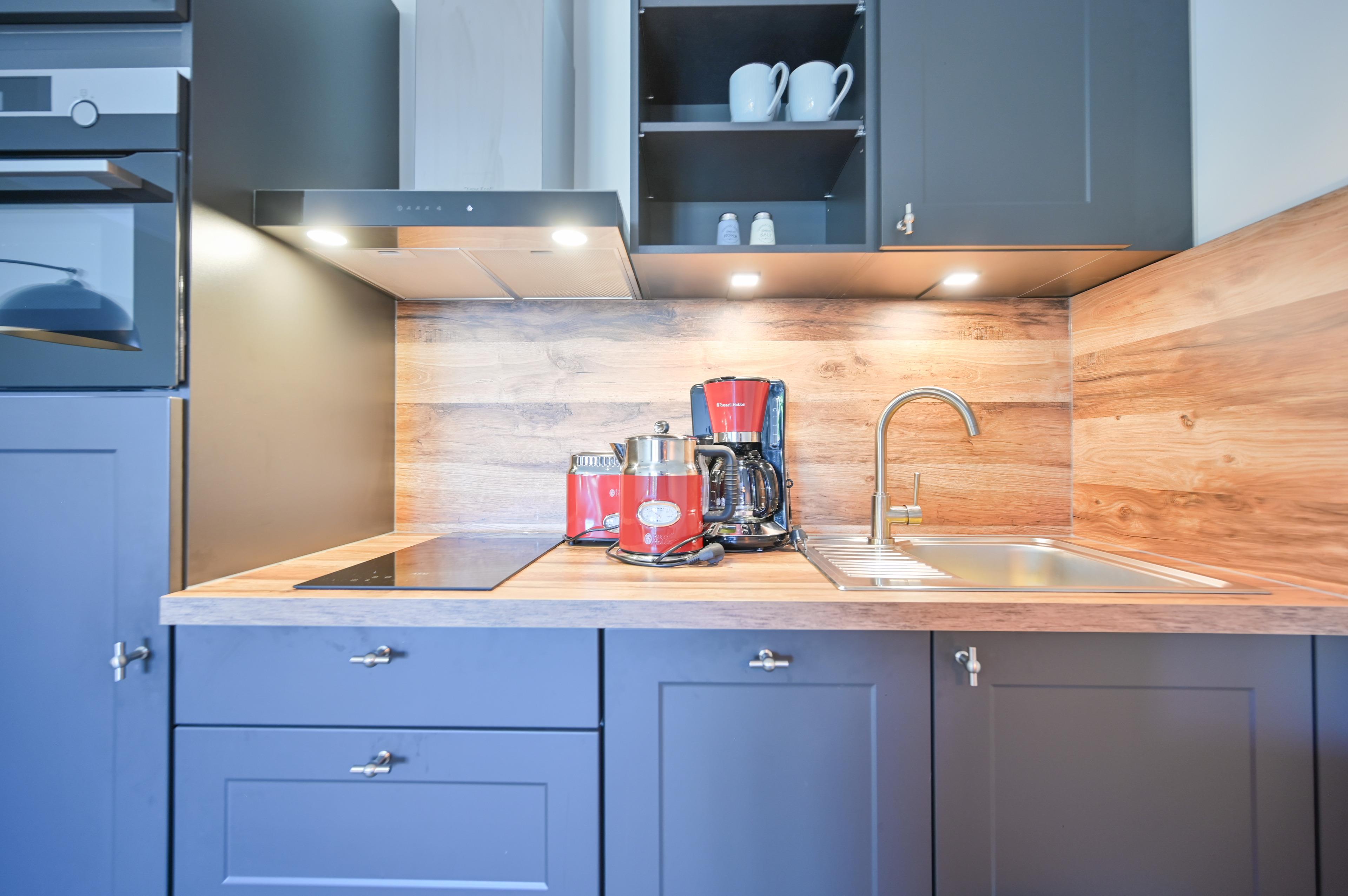 Das Wohnschlafzimmer mit Doppelbett, Nachttischen, integrierter Küchenzeile, Tisch und zwei Stühlen bietet Gästen wunderbare Möglichkeiten, es sich rundum gemütlich zu machen.