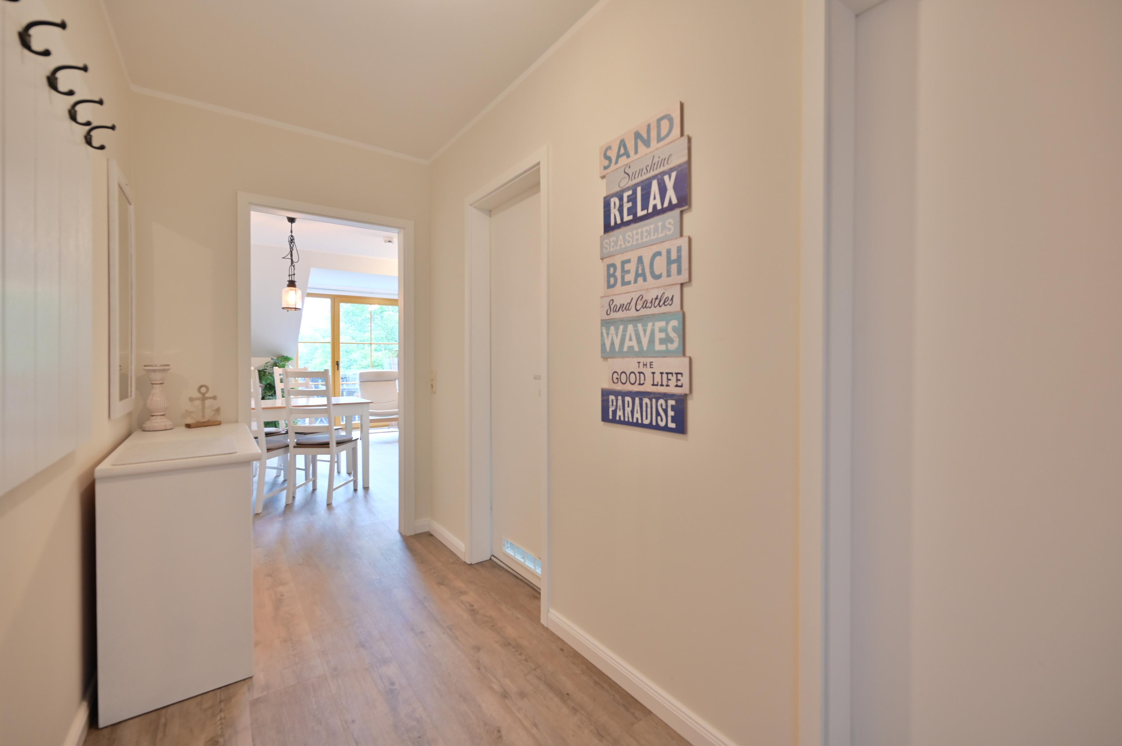 Sie erreichen die Wohnung im ersten Obergeschoss über den geräumigen und einladenden Flur mit Garderobe, Spiegel und großem Dielenschrank. Von hier aus gelangen Sie in den Wohn/Essbereich mit der schön ausgestatteten Küche, Esszimmermöbeln, dem Wohnbereich mit Schlafcouch für 1 Person, Sessel, Couchtisch, Stehlampe, großem Flachbildschirm, Radio/ Stereoanlage und direktem Zugang zum Balkon mit Möbeln.