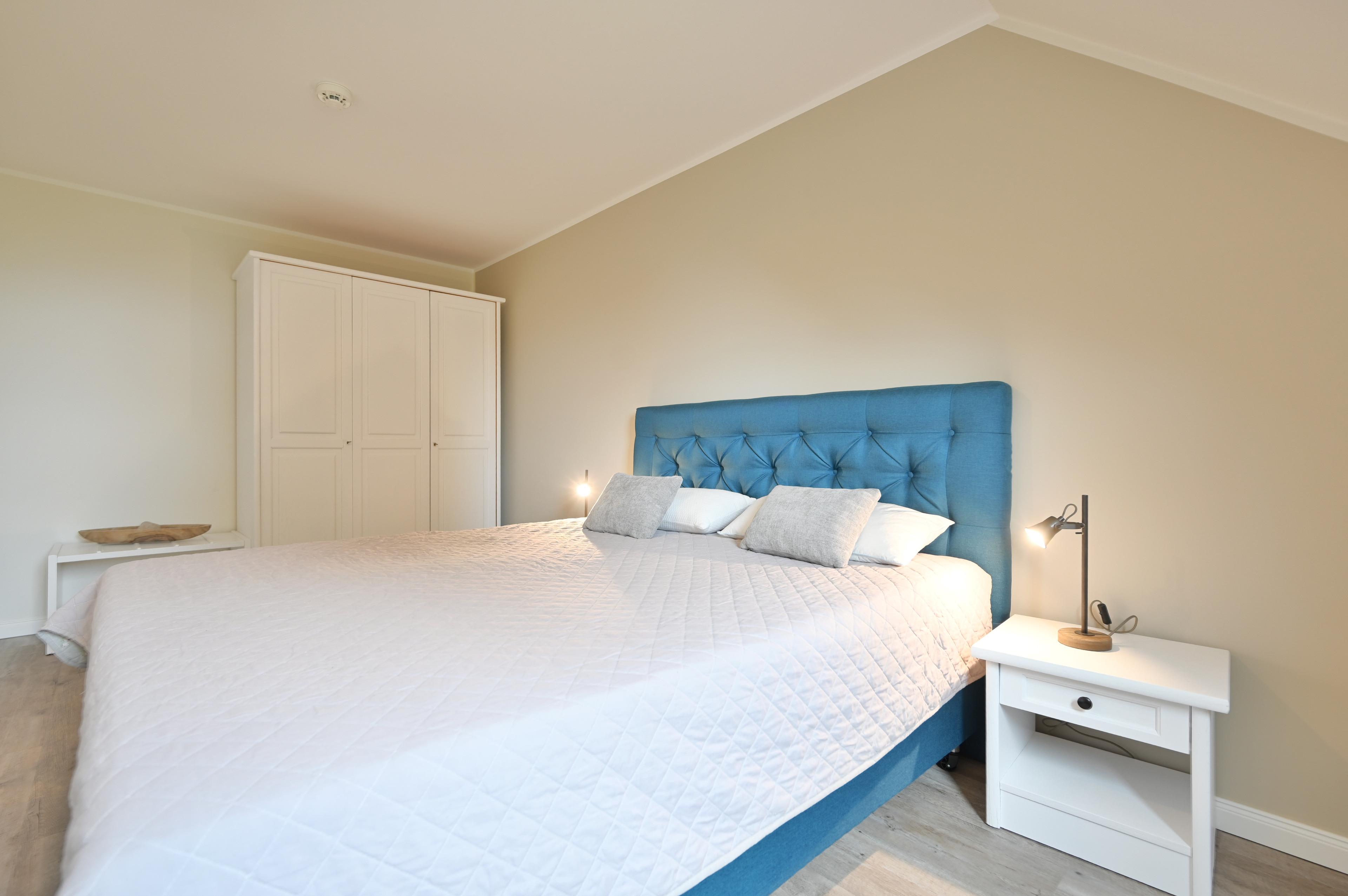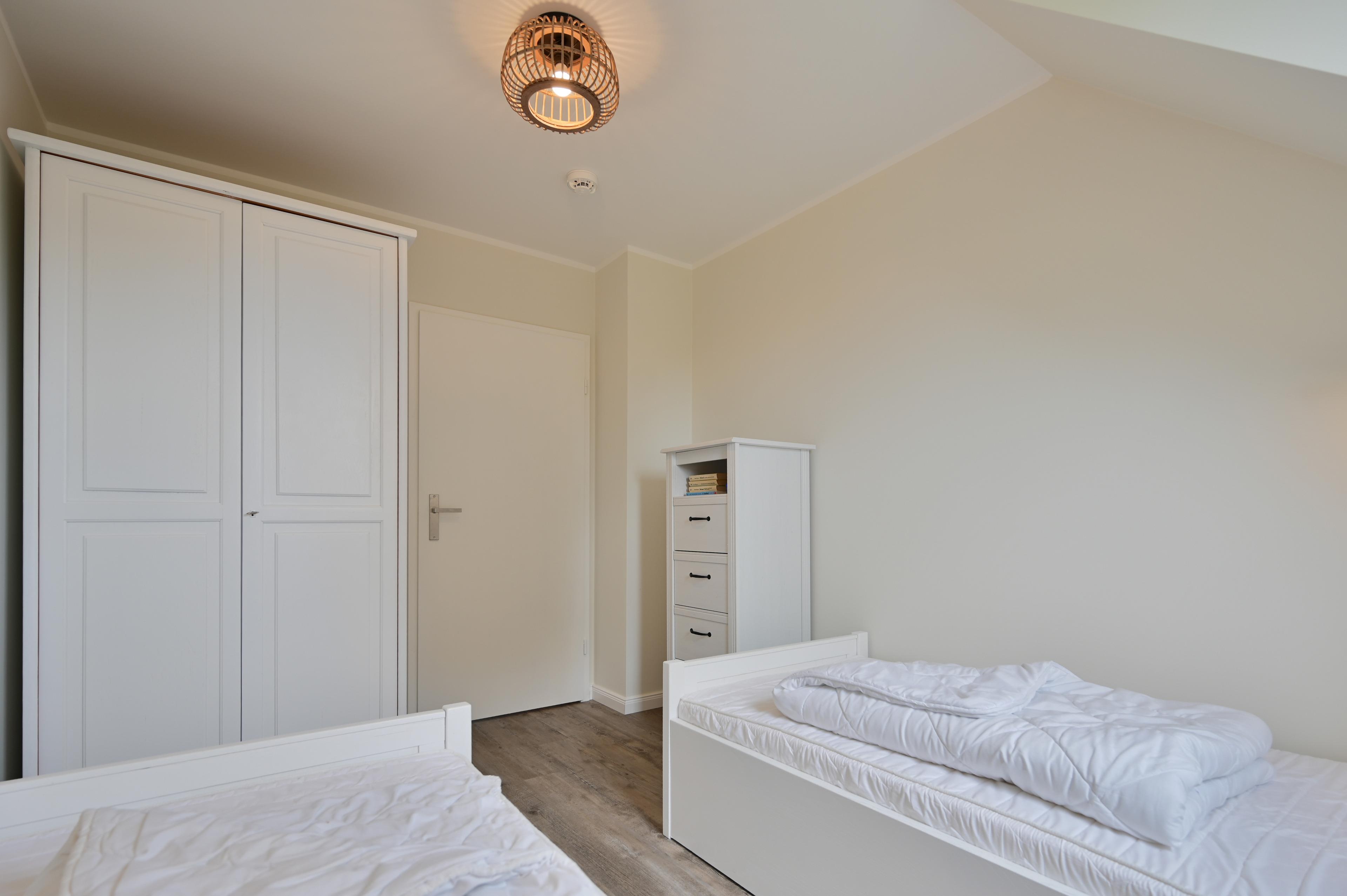 Weiterhin erreichen Sie über den Flur das neue, schöne Badezimmer mit Dusche /WC sowie das große Schlafzimmer mit Doppelbett, Nachttischen, 3-türigem Kleiderschrank, einer weiteren Kommode und genügend Platz für ein zusätzliches Kinderbett. Im gemütlichen Kinderzimmer befinden sich 2 Einzelbetten, ein großer Schreibtisch mit Stuhl und ein 2-türiger Kleiderschrank. Beide Schlafzimmer haben Verdunklungsgardinen.